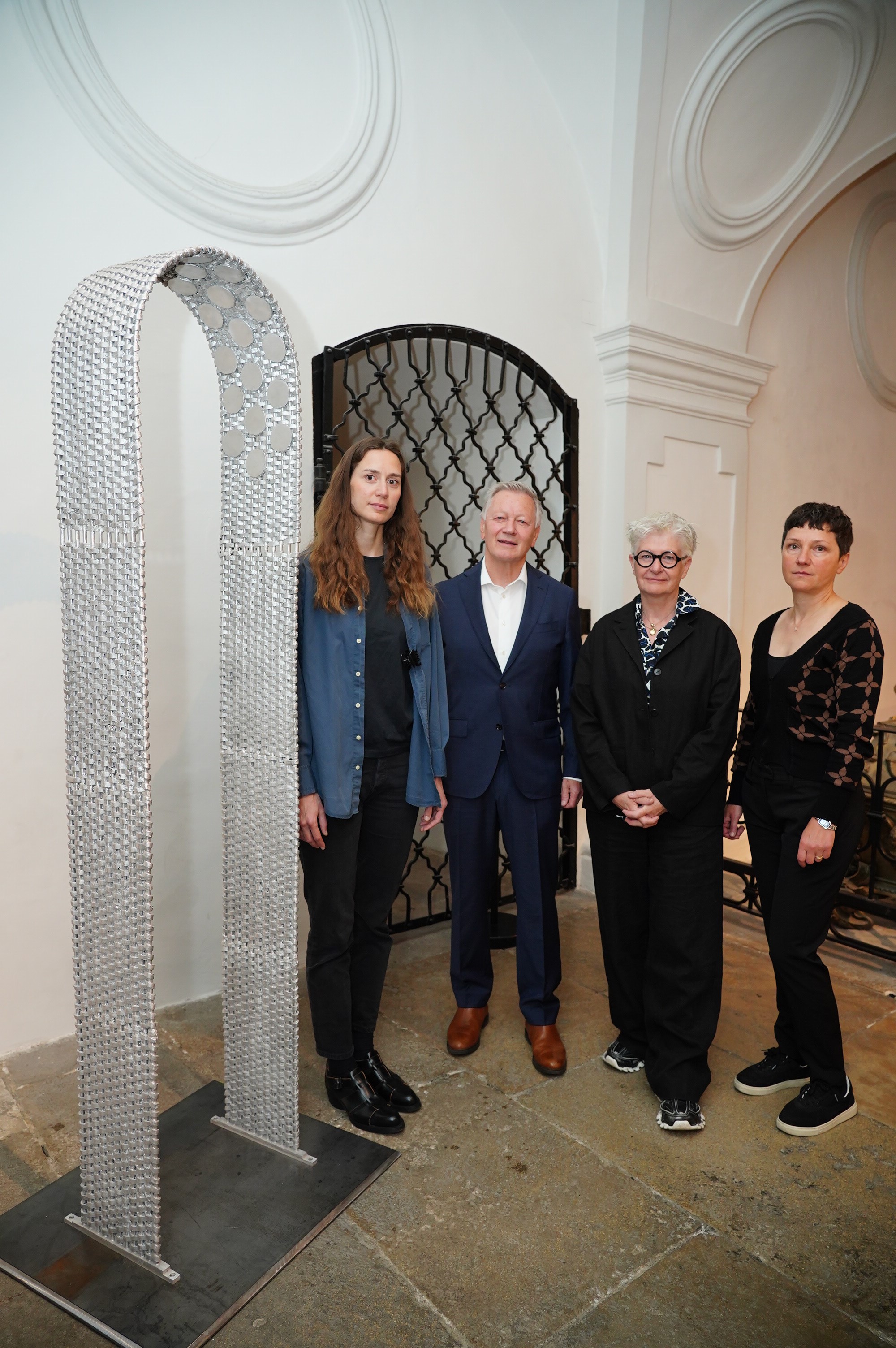 Im Februar 2023 entschied sich eine hochkarätig besetzte Jury für das Projekt der jungen Wiener Künstlerin Nicoleta Auersperg. Die Künstlerin, die unter anderem an der Universität für angewandte Kunst in Wien studierte, hat die Jury und den Vorstand der Seraphiner Stiftung überzeugt. „Basierend auf den Vorgaben der Stiftung wollte ich ein bogenförmiges Kunstwerk schaffen, das sich einerseits behutsam in den geschichtsträchtigen Raum der Kapuzinergruft einfügt und andererseits an die großzügigen Zustifter:innen erinnert. Die dort verewigten Namen stellen symbolisch das Gerüst des Transitus dar und tragen die Sozialstiftung. In der Lebenshilfe Landeck habe ich mit den Klient:innen Cheyenne Mangott, Simon Ladner, Reinhard Jochum, Ibrahim Barlas und dem Tischler Christian Wechner ein hochmotiviertes Team gefunden, das das geflochtene Grundgerüst, aus dem der Metallabguss entstanden ist, wesentlich mitgestaltet hat“, erklärt Auersperg.