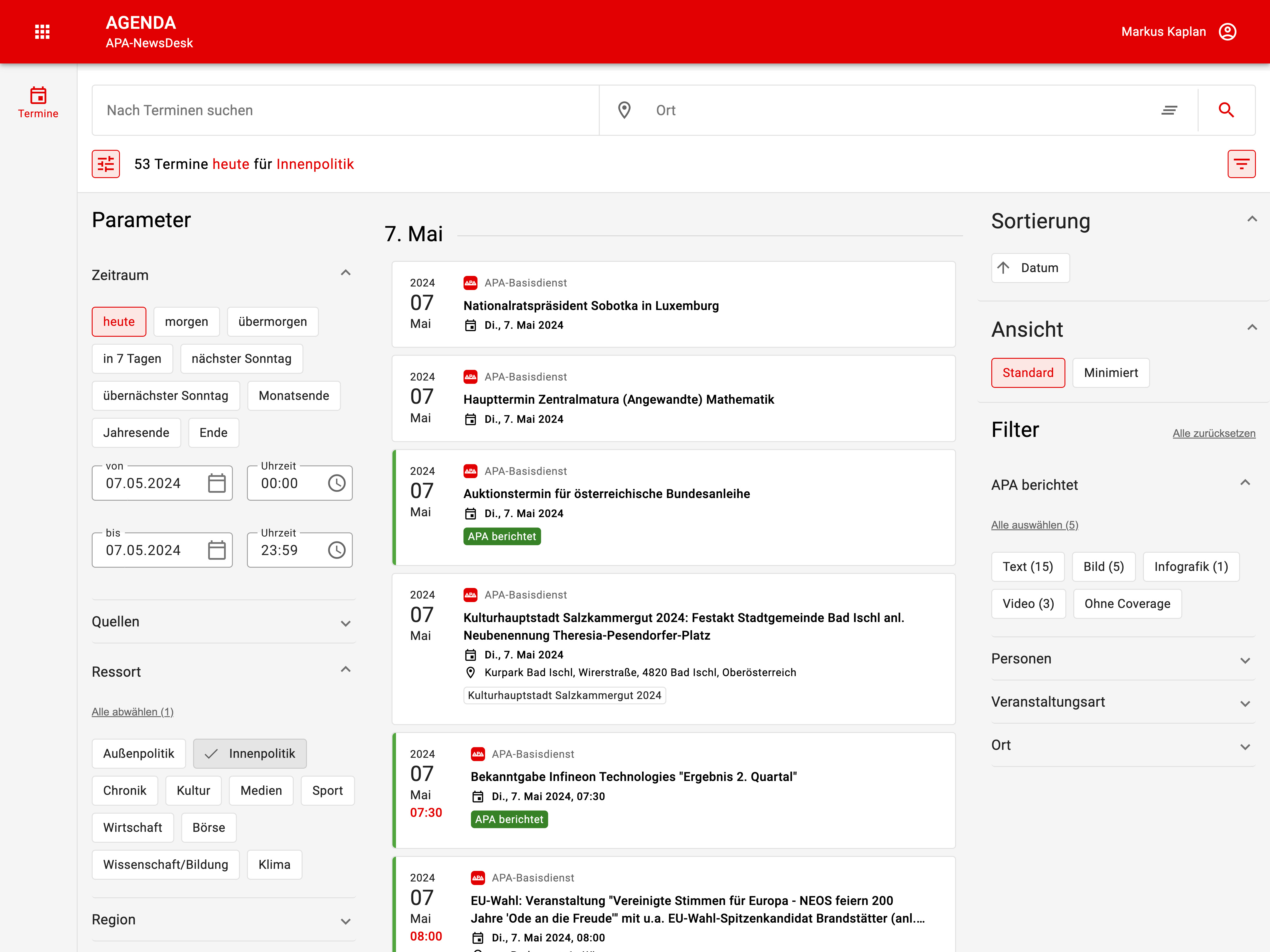 Das Agenda-Modul bietet den vollständigen Terminkalender der APA-Redaktion zu nationalen und internationalen Themen, Ereignissen und Events – inklusive Live-Überblick, zu welchen Terminen die APA berichten wird. Ersichtlich sind außerdem via APA-OTS eingesandte Termine, Pressekonferenzen und Veranstaltungen.