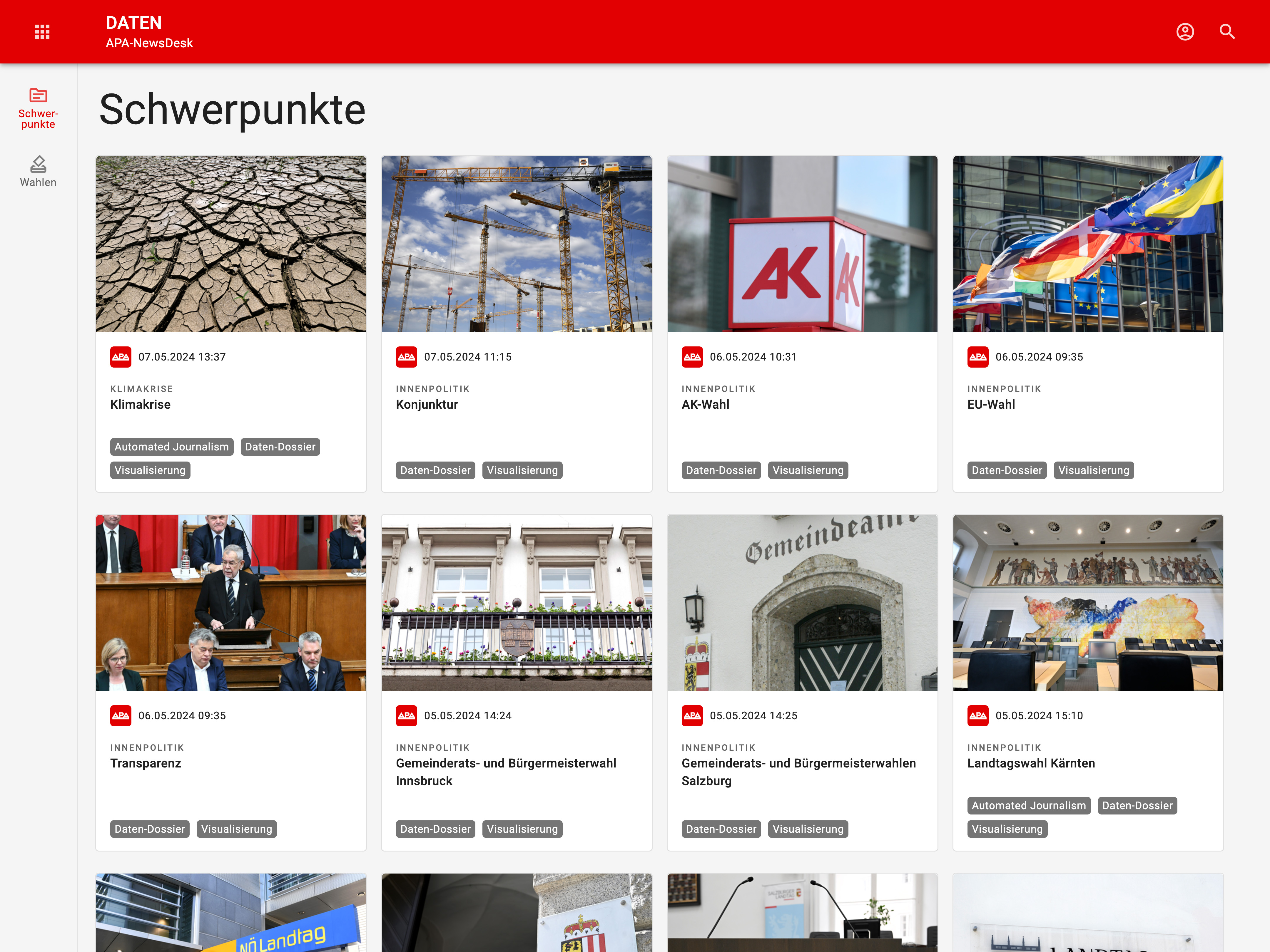 Das Daten-Modul bündelt alle datenintensiven APA-Inhalte. Verfügbar sind einerseits umfangreiche Datenpakete zu den Themen Innenpolitik und Klimakrise inklusive Infografiken, interaktiven Visuals und Automated Content. Das Modul umfasst – pünktlich zum Superwahljahr – auch die Plattform „APA-Wahlen“ mit aktuellen Wahlergebnissen und Auswertungen sowie Liveblogs, die am Wahltag das Wahlgeschehen in real-time zusammenfassen.