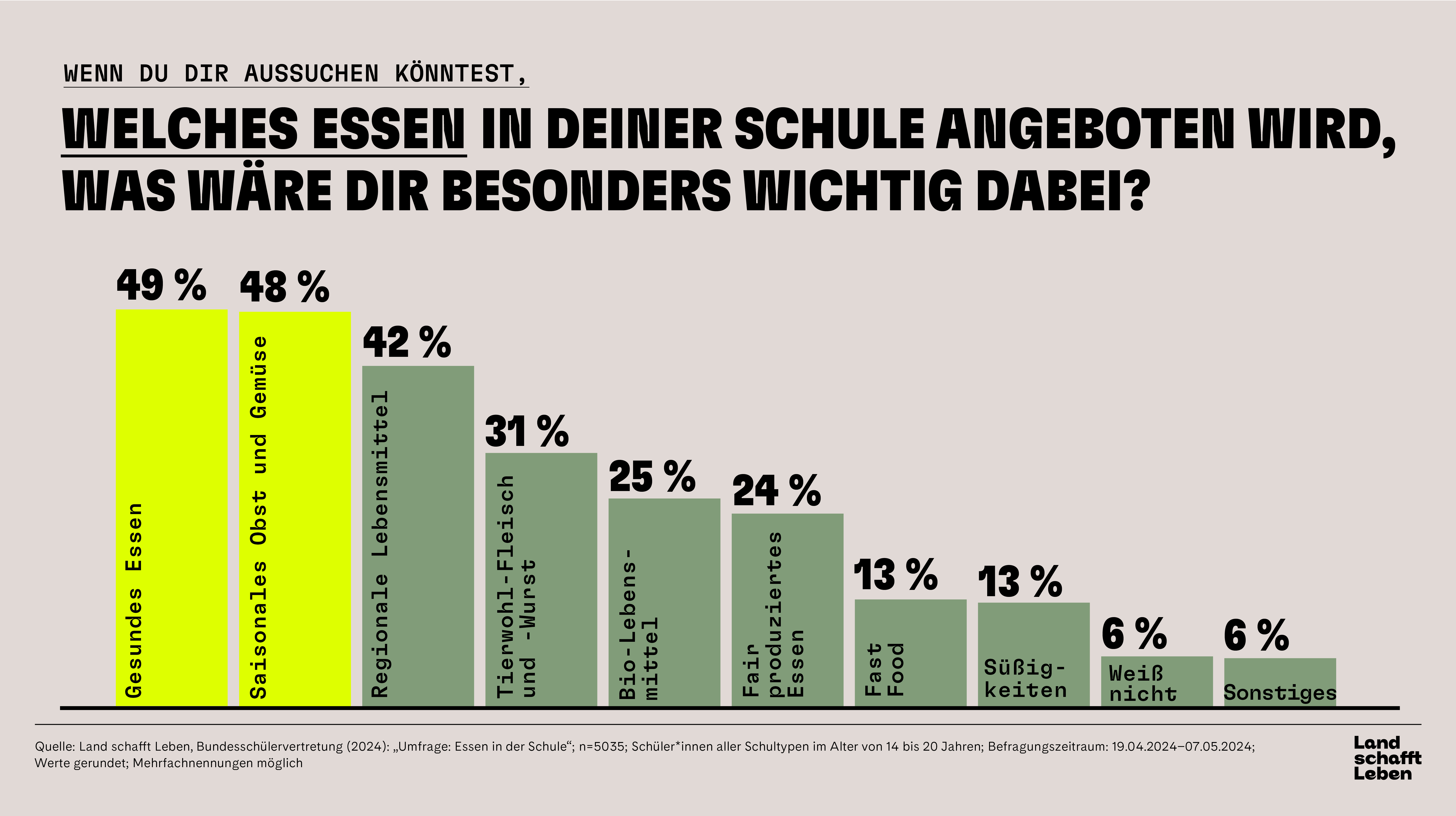 Die Relevanz dieser Themen spiegelt sich auch in den Wünschen der Jugendlichen an die Verpflegung in der Schule wider. Über 80 Prozent der Befragten ist es wichtig („eher wichtig“, „wichtig“ oder „sehr wichtig“), dass an ihrer Schule gesundes Essen angeboten wird. Auf die Frage, was ihnen besonders wichtig wäre, wenn sie sich das Speisenangebot in ihrer Schule selbst aussuchen könnten, antwortete fast die Hälfte mit „gesundes Essen“ und „saisonales Obst und Gemüse“.