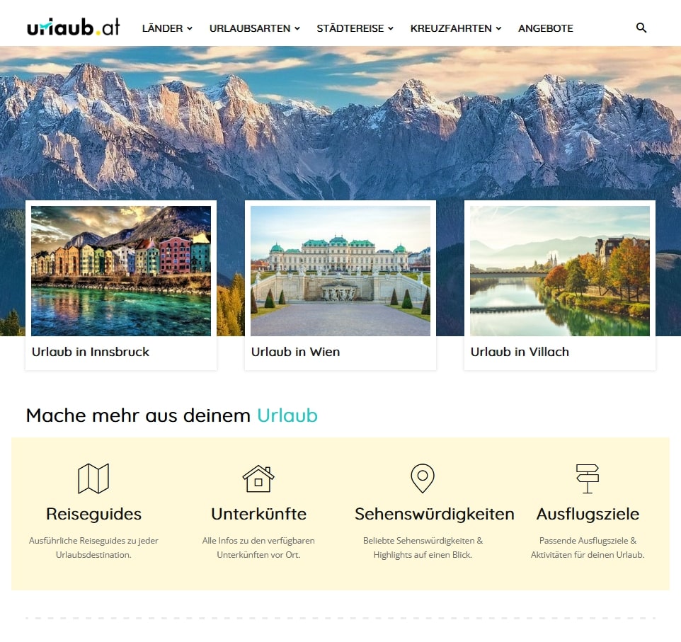 Urlaub.at ist ein unverzichtbares Instrument für jeden, der Österreich besuchen möchte. Das Portal versorgt zukünftige Gäste mit allen notwendigen Informationen, inspiriert zu Freizeitaktivitäten, präsentiert großartige Hotels und zeigt auf, warum das Land so vielfältig ist.