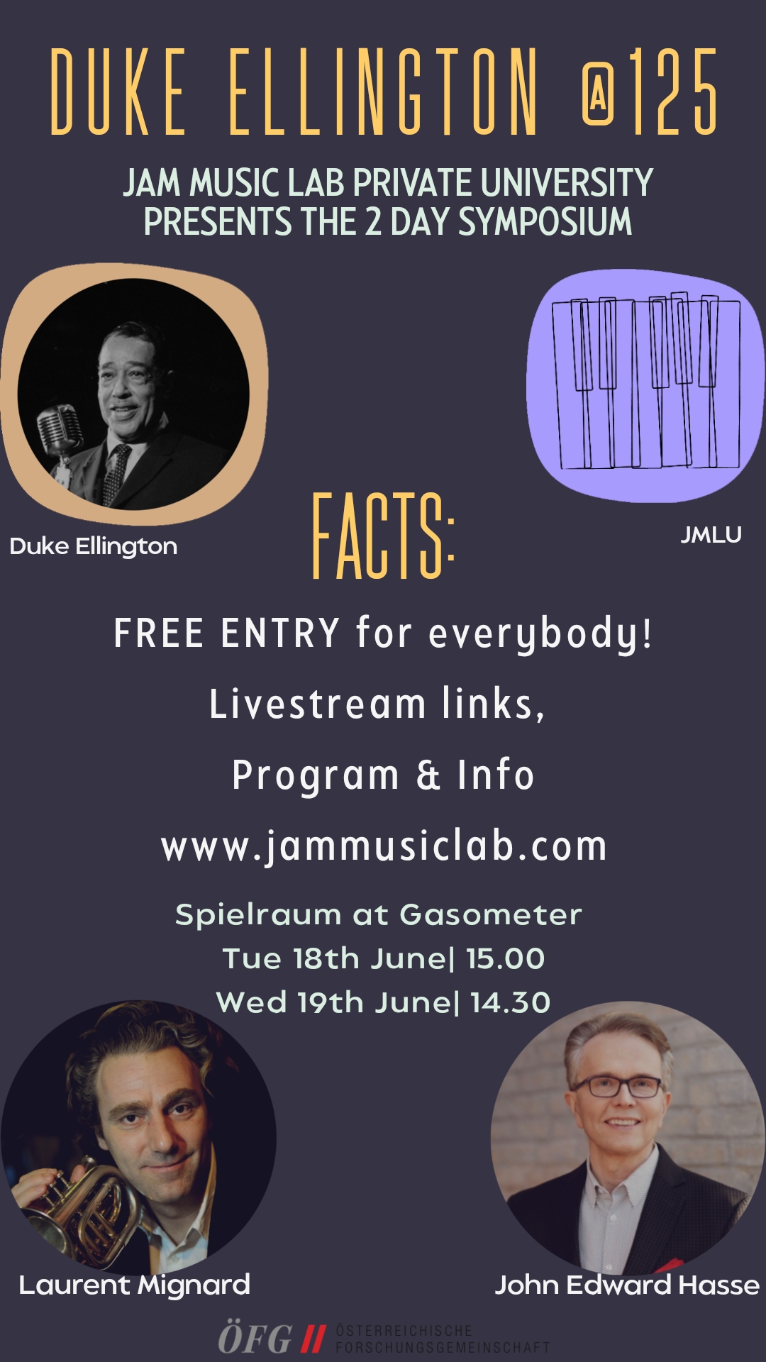 Zur Feier des 125. Geburtstags von Duke Ellington veranstaltet die JAM MUSIC LAB Privatuniversität für Jazz- and Popularmusik am 18. und 19. Juni 2024 im Spielraum des Gasometers Wien ein Symposium. Ziel dieses Events ist es, die musikalische, soziale und kulturelle Bedeutung dieses herausragenden Musikers sowohl im historischen als auch im aktuellen Kontext zu beleuchten. Jede:r Interessent:in für Ellington und dessen Schaffen ist herzlich eingeladen teilzunehmen. Der Eintritt für dieses Event ist kostenlos.