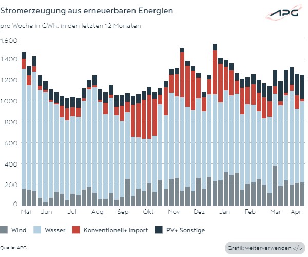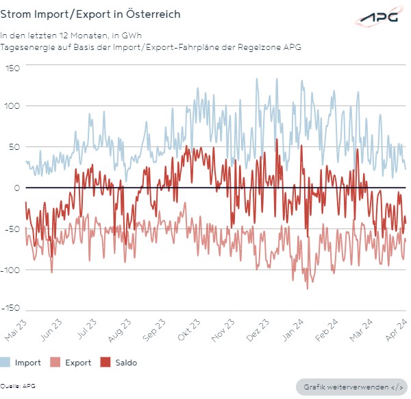 „Durch die gute Produktion aus erneuerbaren Energiequellen konnte in Österreich ein Stromüberschuss produziert werden, der dazu führte, dass Österreich (um genau zu sein die Regelzone APG) an jedem Tag im April Strom ins Ausland exportieren konnte.“, erklärt Gerhard Christiner, technischer Vorstand der APG. „Durch den starken Ausbau der Erneuerbaren schaffen wir es jedes Jahr mehr vom jährlichen Stromverbrauch durch erneuerbare Energien zu decken. Diese erfreuliche Entwicklung bedingt jedoch gerade für die zukünftigen Wachstumsraten an installierten Erneuerbaren auch den kontinuierlichen Ausbau der gesamten Strominfrastruktur bzw. auch der Speicher. Die dafür notwendigen gesetzlichen Rahmenbedingungen – Stichwort EABG bzw. ELWG – müssen endlich auf den Weg gebracht werden.“