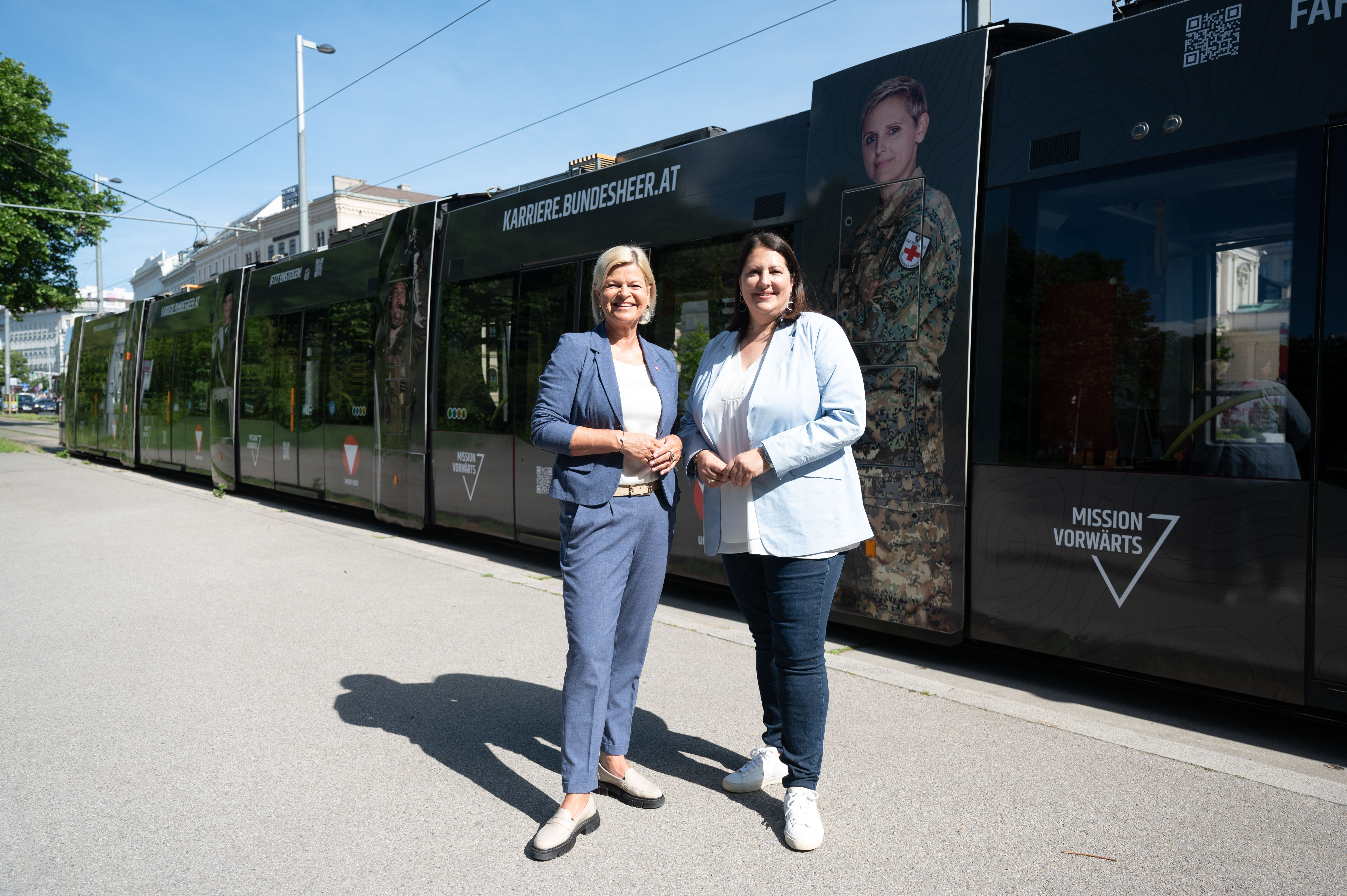 Am Donnerstag, den 23. Mai 2024, präsentierten Verteidigungsministerin Klaudia Tanner und Vizebürgermeisterin der Stadt Wien, Kathrin Gaál, die erste „Bundesheer-Bim“. Anlässlich der Personaloffensive des Bundesheeres sind die gebrandeten Straßenbahnen der Wiener Linien bis Mitte August in Wien unterwegs. Dabei werden die Linien der Remise Floridsdorf befahren, darunter die Linien 2 (Friedrich-Engels-Platz – Dornbach), 25 (Aspern – Floridsdorf), 26 (Hausfeldstraße – Strebersdorf) sowie 31 (Schottenring – Stammersdorf).