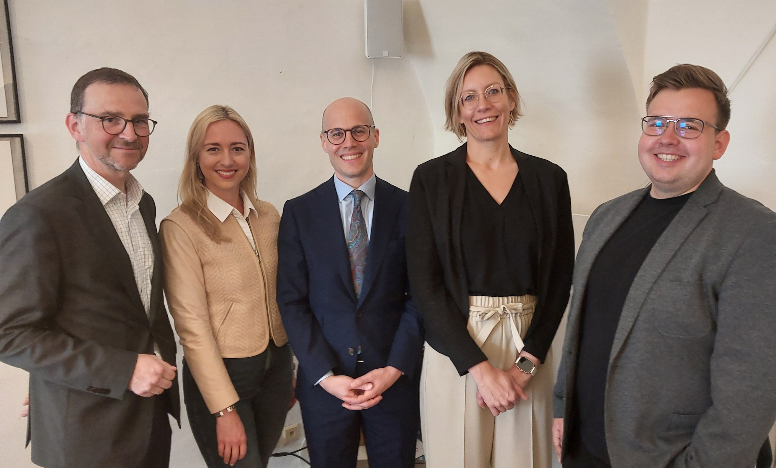 Juridicum-Vizedekan Christian Koller, Michaela Schneider, Stefanie Thuiner und FV Jus-Vorsitzender Elias Schmidt diskutierten mit VUJ-Vorstand Bernhard Breunlich
