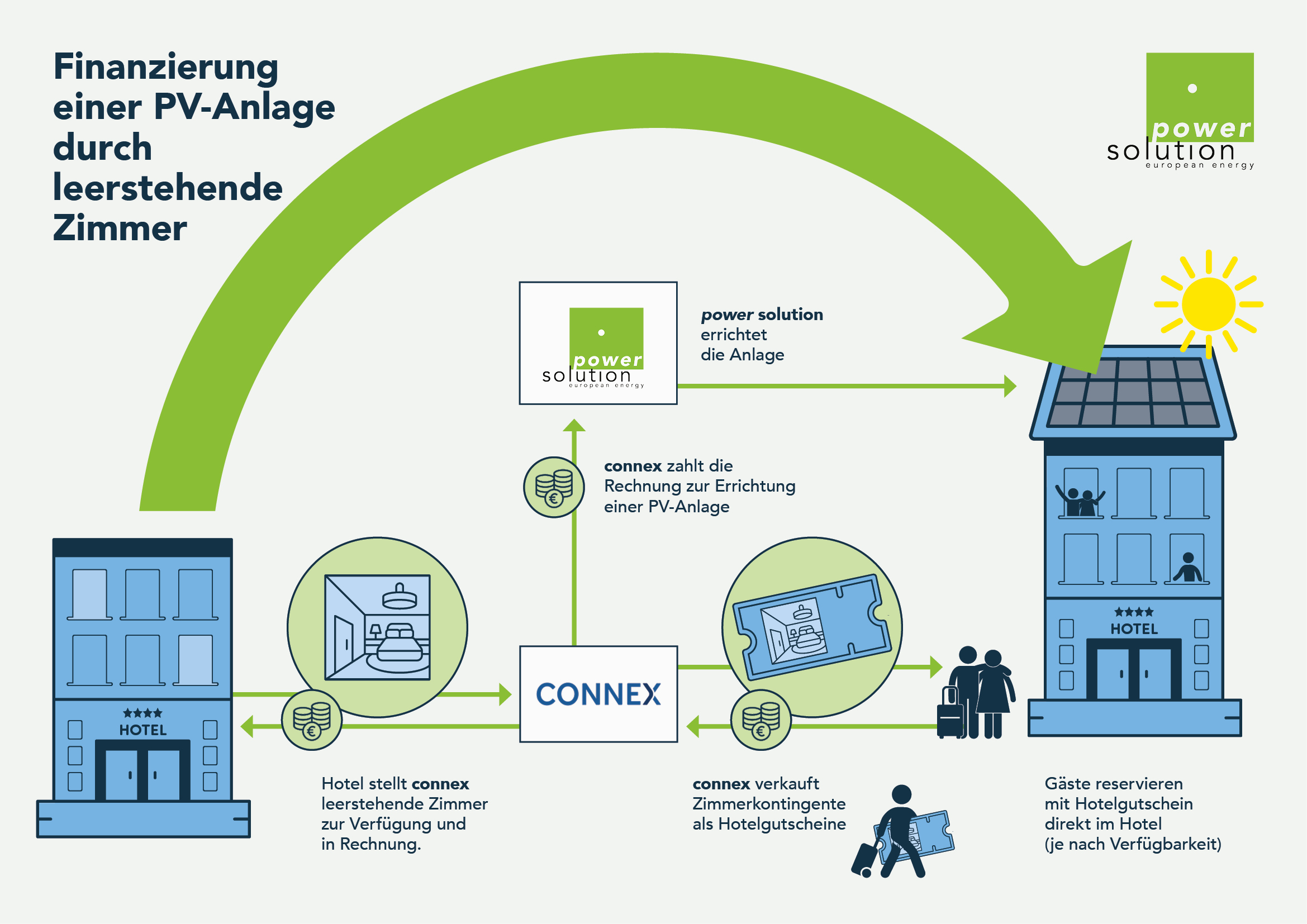 Das funktioniert wie folgt: Das Hotel beauftragt power solution mit der Errichtung einer PV-Anlage. Im Gegenzug stellt das Hotel Connex ein bestimmtes Zimmerkontingent zur Verfügung und in Rechnung. Connex zahlt die Rechnung an power solution – mit schuldbefreiender Wirkung für den bzw. die Hoteleigentümer/-in. Die Zimmer werden von Connex an Dritte in Form von Hotelgutscheinen vertrieben. Die Gäste, die die Hotelgutscheine von Connex erwerben, reservieren damit direkt im Hotel.