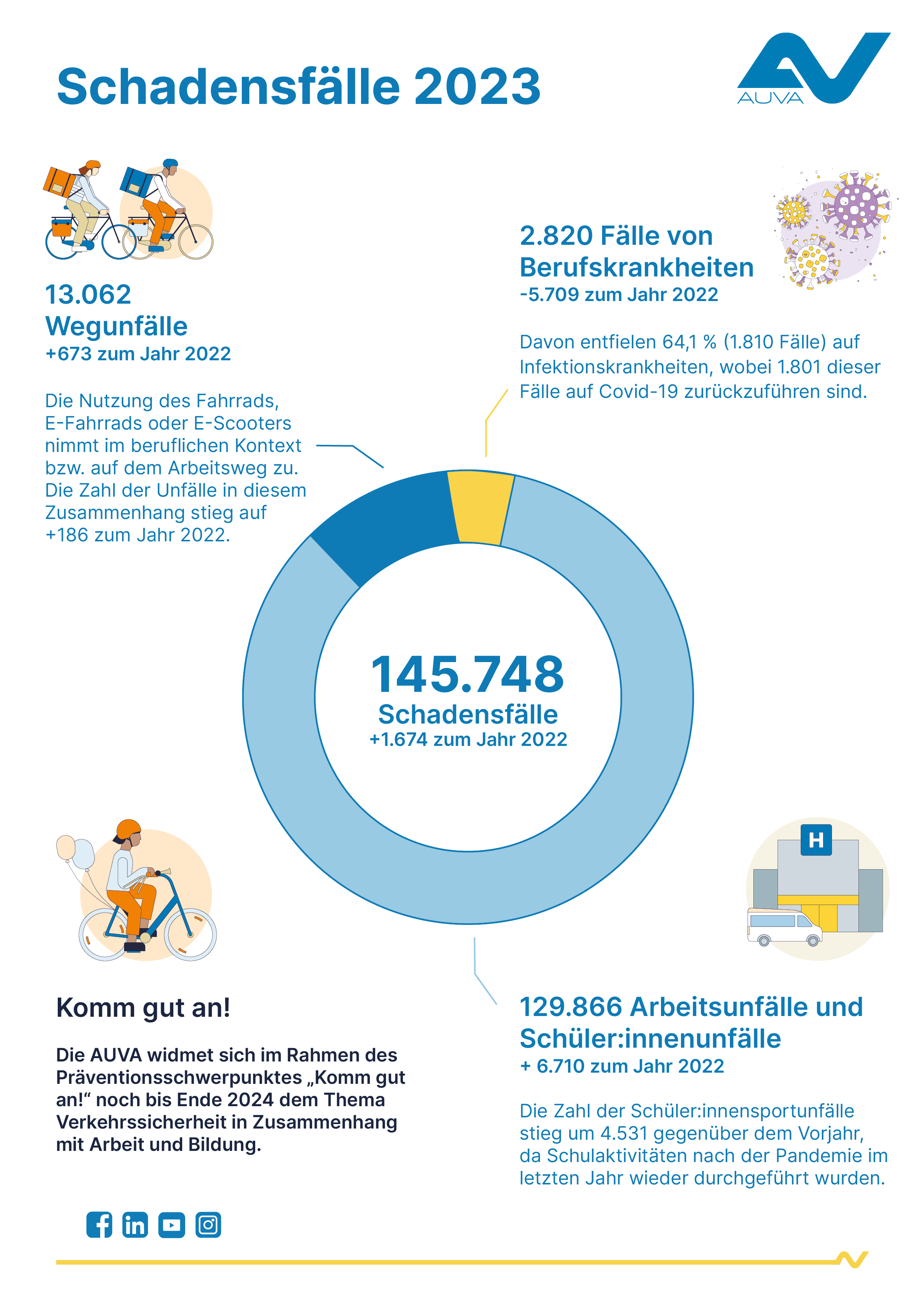 Insgesamt wurden im vergangenen Jahr 145.748 Schadensfälle registriert (+ 1.674 zum Jahr 2022), dabei handelt es sich in 129.866 Fällen um Arbeitsunfälle und Schüler:innenunfälle (+ 6.710), in 13.062 Fällen um Wegunfälle (+ 673) sowie um 2.820 Fälle von Berufskrankheiten (- 5.709).