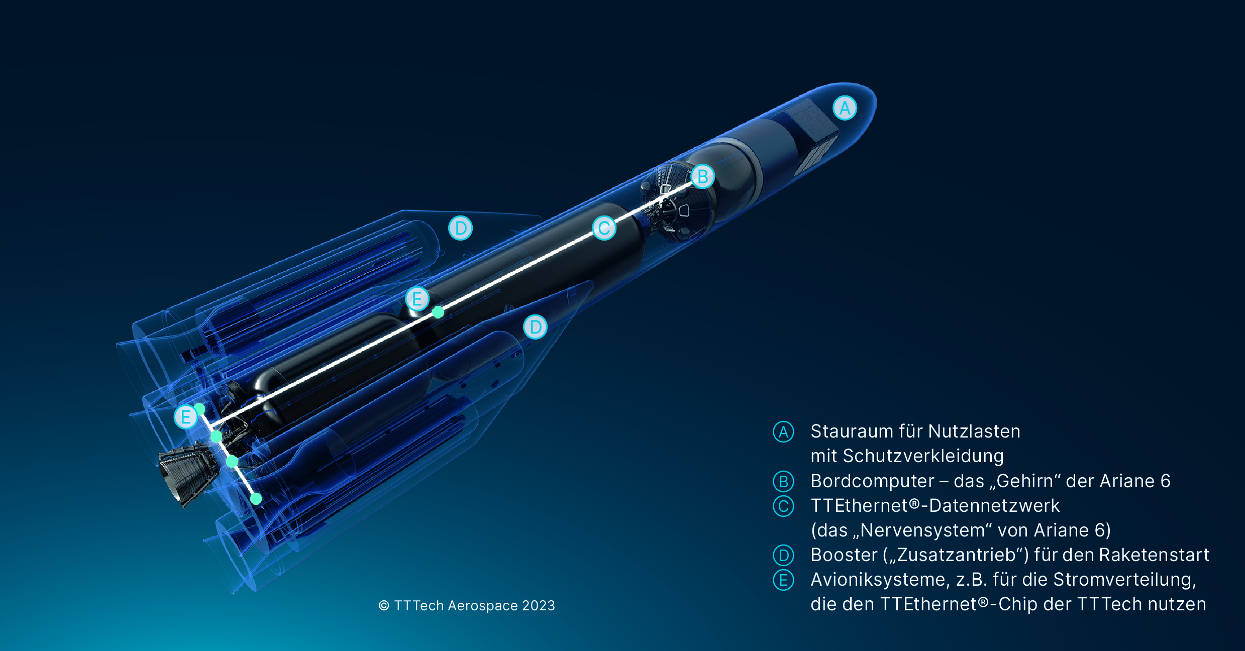 Die Ariane 6 Avionik entstand aus einer Forschungsaktivität der französischen Weltraumorganisation (CNES) und später der Europäischen Weltraumagentur (ESA), an dem wichtige europäische Luft- und Raumfahrtunternehmen wie Airbus beteiligt waren. TTTech arbeitete hier vor allem am Datennetzwerk, mit dem Ziel, die Kommunikation und Datenübertragung in der Trägerrakete sicher und effizient zu gestalten und die für den Aufbau des Netzwerks benötigten Komponenten (Chips) möglichst kompakt zu designen. Die Kofinanzierung über das Future Launchers Preparatory Program (FLPP) der ESA ermöglichte es TTTech, den ersten Chip Prototyp und die dazugehörige Software zu entwickeln. Dieser strahlungsfeste und für die Verwendung im Weltraum qualifizierte Chip wurde dann 2015 von ArianeGroup für das Ariane 6 Programm ausgewählt.