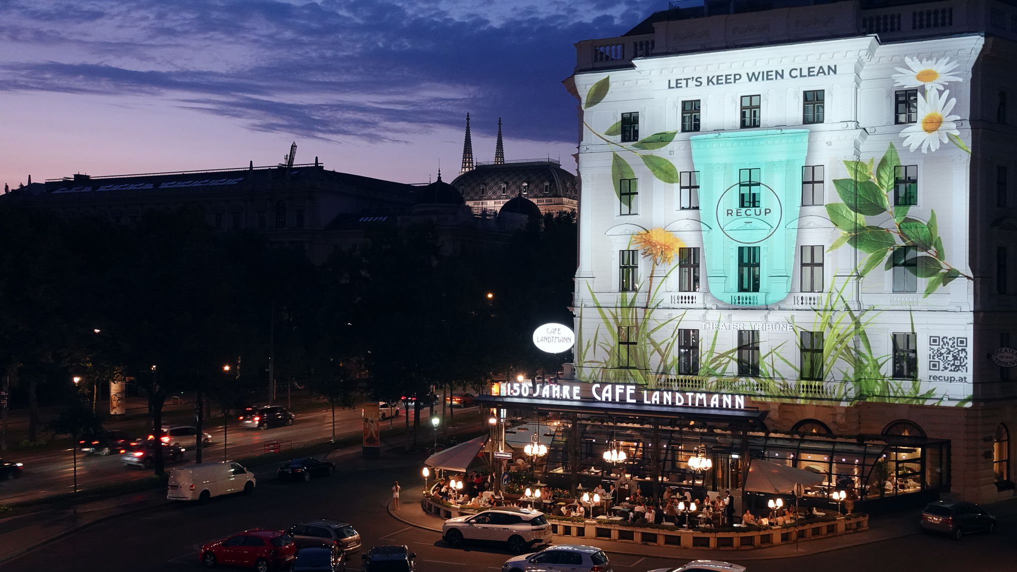 Vom 17. bis 23. Juli 2024 ab ca. 21:30 Uhr zeigt eine Projektion auf der 300 qm großen Hauswand des Café Landtmann, am Universitätsring in Wien, den RECUP-Mehrwegbecher als Antwort auf die Müllproblematik durch To-go-Becher. Begleitet wird die Aktion mit dem Slogan "Let's keep Wien clean", der die einfache und effektive Alternative zu Einwegverpackungen unterstreicht. Alexander Burger, Head of Marketing von RECUP, betont: "Mit unserer Kampagne 'Let's keep Wien clean' wollen wir zeigen, dass es eine einfache und praktische Lösung für das Problem Einwegverpackung gibt und dazu aufrufen, gemeinsam mit allen Wienerinnen und Wienern aktiv Einwegmüll zu reduzieren". Die Kampagne wurde gemeinsam mit der Agentur I like Visuals entwickelt und umgesetzt. Neben der Out-of-Home-Projektion wird die Kampagne aktiv in den sozialen Medien begleitet. Darüber hinaus macht ein mobiles Espressomobil das RECUP-System vor Ort erlebbar: Vom 17. bis 21. Juli 2024 können Gastronomiebetriebe und Endverbrauchende an der Hauptuni Wien und im Votivpark gratis Kaffee im RECUP genießen und sich über das Mehrweg-Pfandsystem informieren.