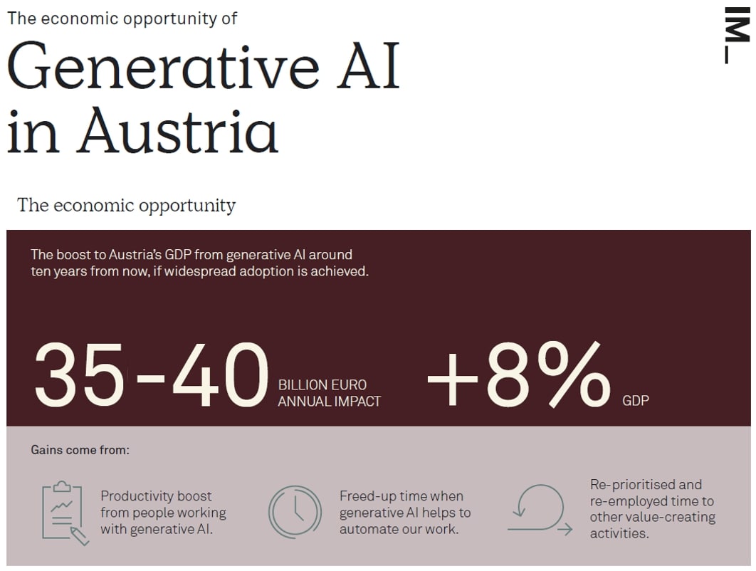 - Der Einsatz von generativer KI kann Österreichs Bruttoinlandsprodukt in zehn Jahren um 35 bis 40 Milliarden Euro steigern