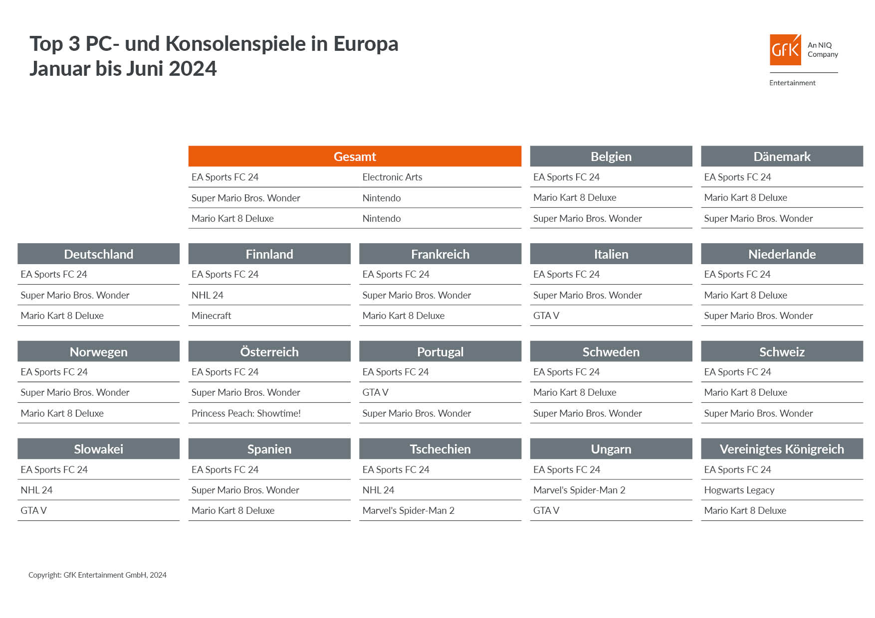 Basis der Sonderauswertung sind die Verkäufe von Video- und PC-Spielen im physischen Markt für die folgenden Länder: Belgien, Deutschland, Dänemark, Finnland, Frankreich, Großbritannien, Italien, Niederlande, Norwegen, Portugal, Österreich, Schweiz, Schweden, Slowakei, Spanien, Tschechien und Ungarn.
