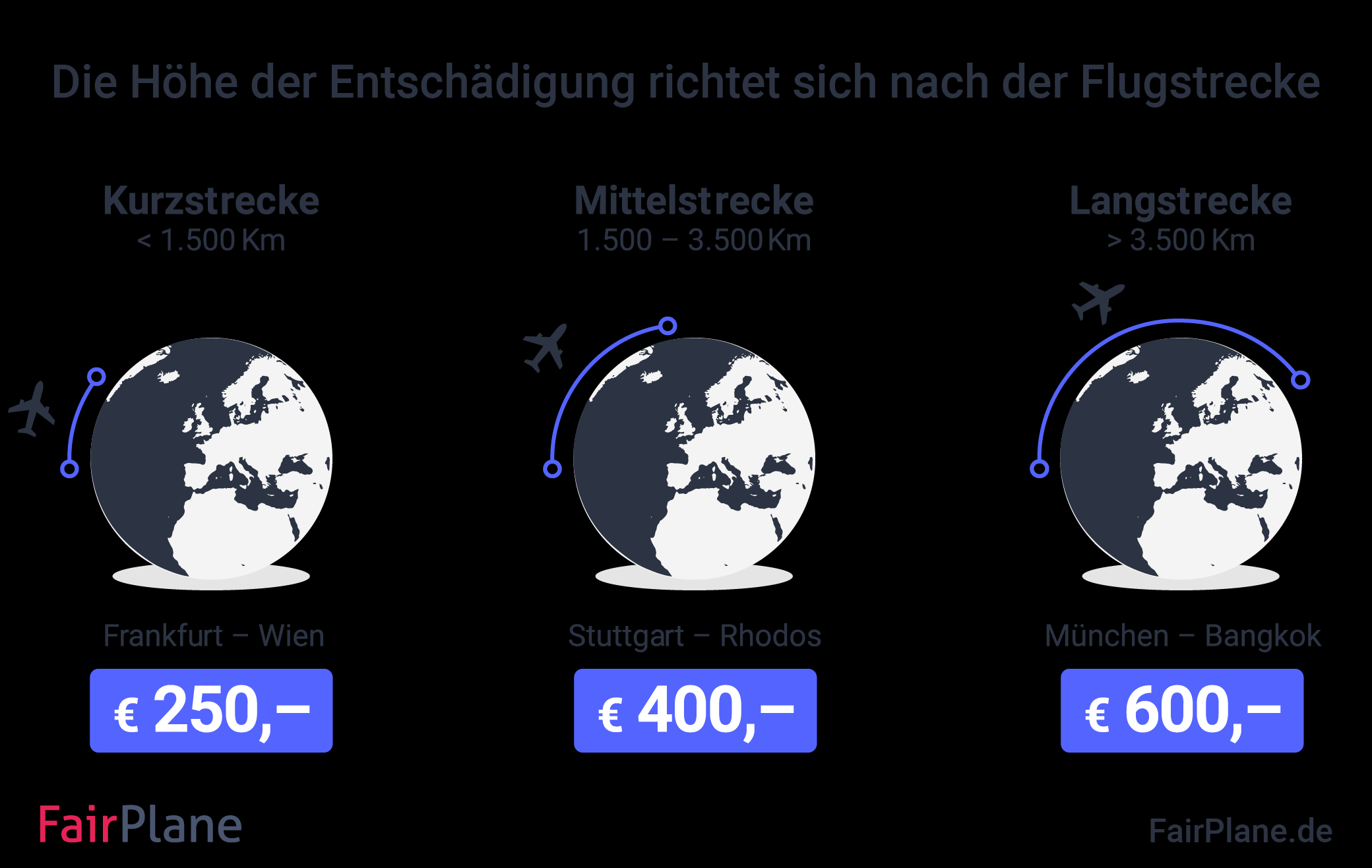 Bei Flugverspätungen von drei Stunden am Zielflughafen, verpasstem Anschlussflug oder kurzfristiger Annullierung (Flug wird weniger als 14 Tage vor dem Abflug abgesagt) kann Anspruch auf eine Ausgleichszahlung bestehen. Nur beim Vorliegen von außergewöhnlichen Umständen ist das Luftfahrtunternehmen von einer Zahlung befreit.