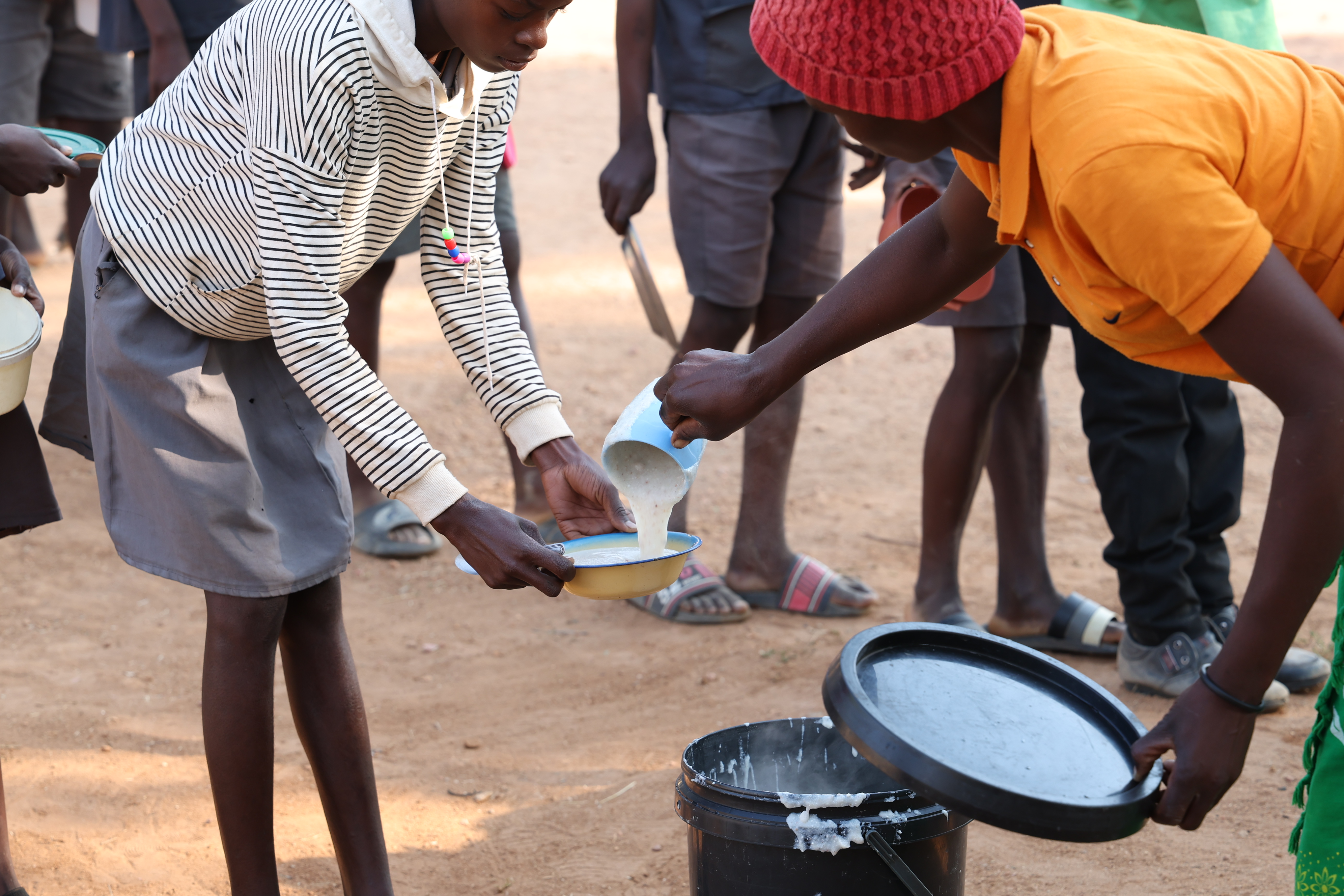 Einmal täglich erhalten alle Kinder ab sofort ein warmes Porridge, hergestellt aus hochkalorischem Maismehl, Erdnussmehl, Salz und Zucker – zubereitet wird das Essen direkt an der Schule. In den Schulen findet der Unterrichtet in zwei Schichten statt – die Hälfte der Kinder lernt vormittags, die andere Hälfte am Nachmittag. Damit alle zu essen bekommen, erhalten die Vormittagsschüler*innen ihr Porridge als spätes Frühstück, die Nachmittagskinder zu Mittag, wenn sie in die Schule kommen.