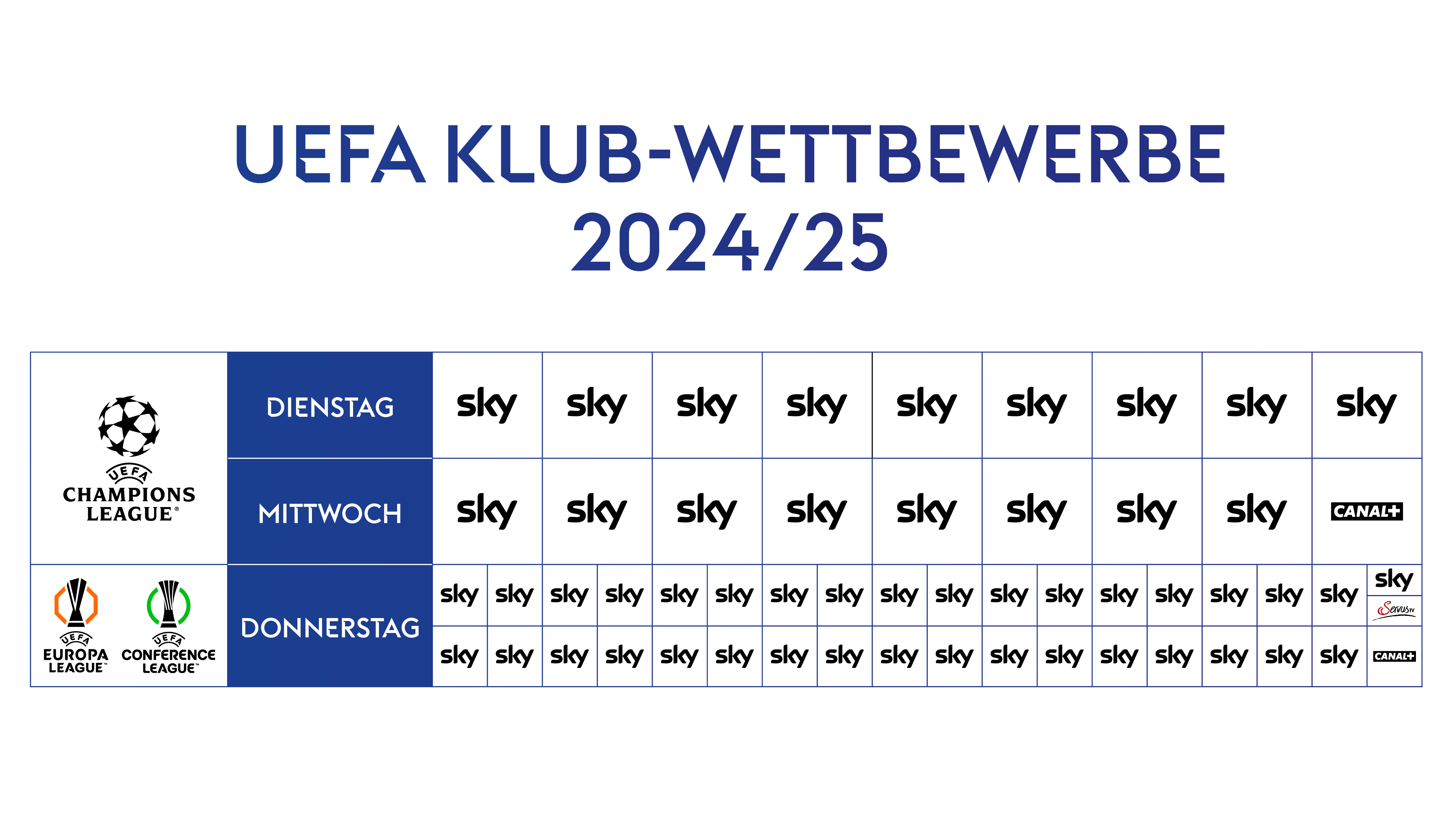 Wenn am Dienstag, dem 17. September zum ersten Mal die Champions League-Hymne in der Ligaphase ertönt und eine neue Ära einleitet, sitzen Sky Seher:innen in der ersten Reihe. Auch bei der UEFA Europa League, die am Mittwoch, den 25. September startet, als auch bei der UEFA Europa Conference League, die am Donnerstag, den 3. Oktober beginnt, zeigt Sky die meisten Duelle live & exklusiv.