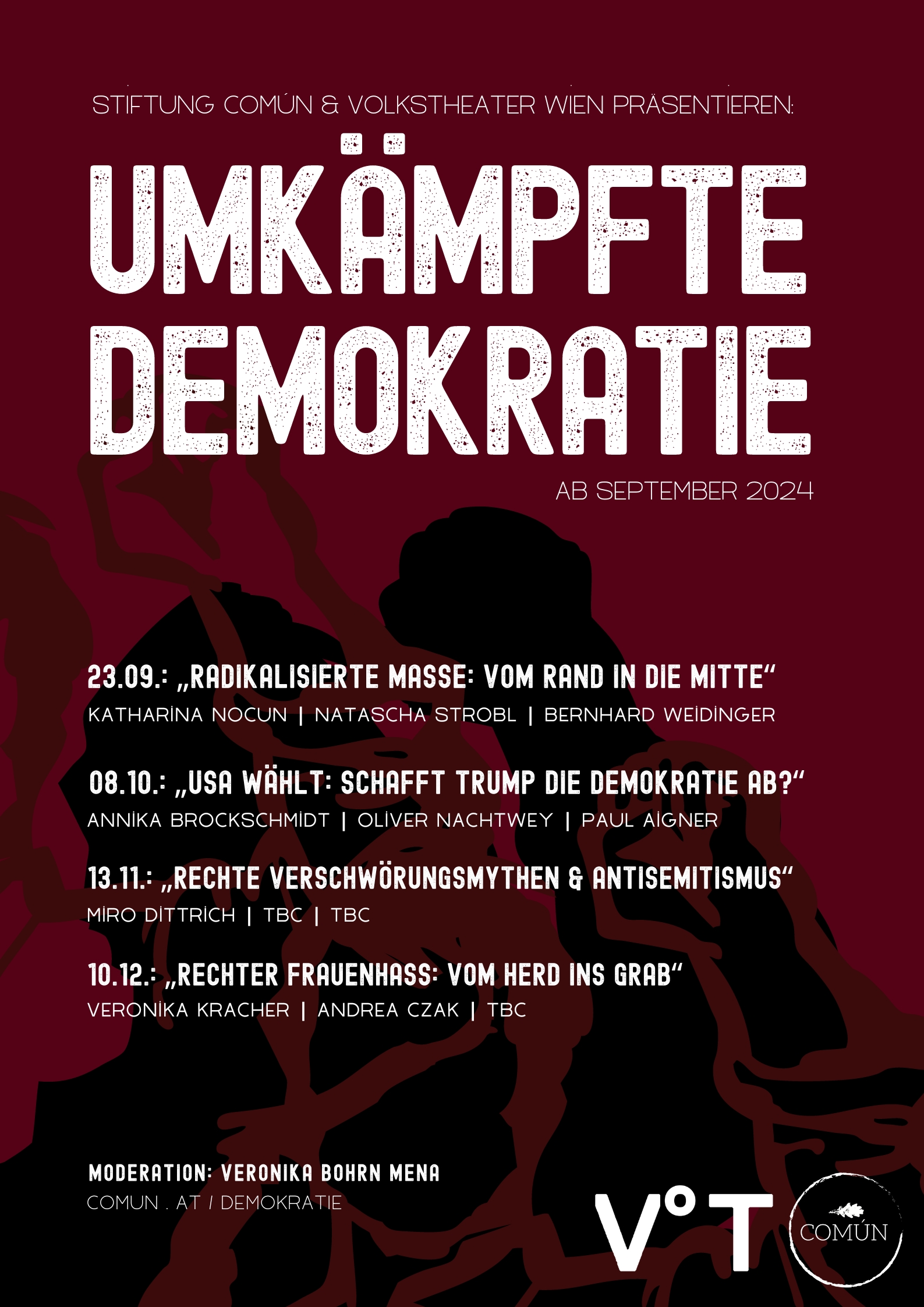 - Umkämpfte Demokratie: In Zusammenarbeit mit dem Volkstheater Wien wird eine mehrteilige Veranstaltungsreihe zum Thema Rechtsextremismus angeboten. Vier Veranstaltungen finden noch im Jahr 2024 statt, der Start erfolgt am 23. September. Dabei werden Themen wie „Radikalisierte Masse“, „Trump und die Demokratie“, „Rechte Verschwörungsmythen“ oder „Rechter Frauenhass“ diskutiert. Persönlich vor Ort Mitwirkende sind u.a. Annika Brockschmidt, Oliver Nachtwey, Katharina Nocun, Natascha Strobl und Veronika Kracher, moderiert wird jeweils von Veronika Bohrn Mena. Mehr Informationen unter https://comun.at/demokratie