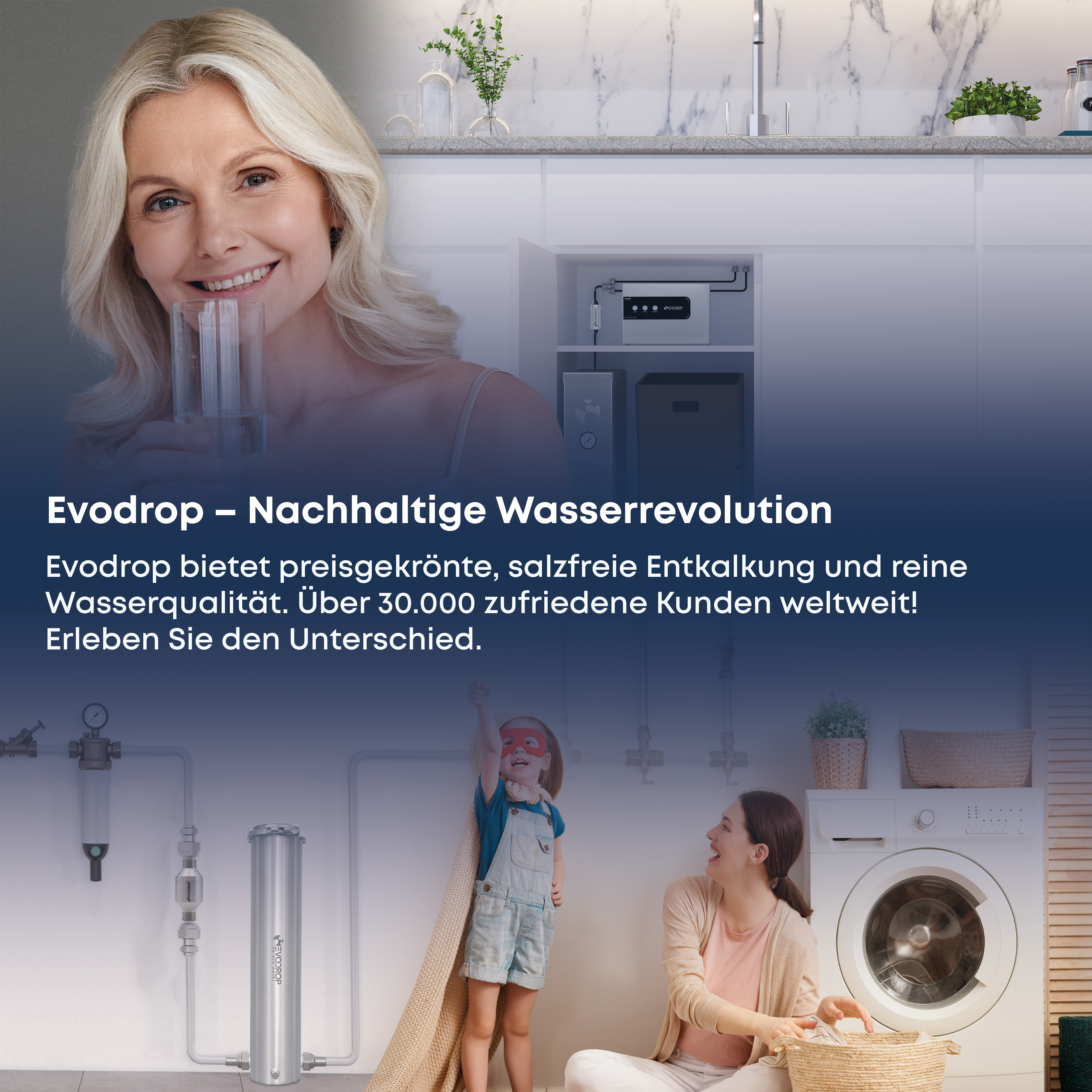 Die Mission des Schweizer Unternehmens Evodrop ist es, Menschen Zugang zu sauberem, gesundem und weichem Wasser zu ermöglichen. Dafür entwickeln die über 50 Mitarbeitenden mit Expertise in Ingenieurswesen, Wissenschaft und Wirtschaft nachhaltige Technologien für die Wasseraufbereitung in Haushalten, Immobilien und Unternehmen. Evodrop konnte bislang neun solcher Systeme zertifizieren lassen. Deren Wirksamkeit wurde in über 30 unabhängigen Studien nachgewiesen und durch renommierte Auszeichnungen für Unternehmertum und Wasseraufbereitung bestätigt. Über 30.000 Kunden in der Schweiz und weltweit vertrauen auf Anlagen von Evodrop.