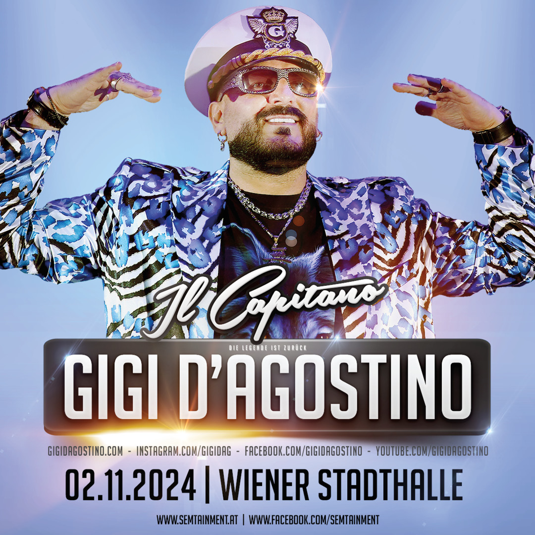 Nach dem unglaublichen Erfolg der ausverkauften Shows in Graz und Klagenfurt, bringt SEMTAINMENT den Kult-DJ Gigi D'Agostino für drei weitere Shows nach Österreich. Somit wird "Il Capitano" mit insgesamt sechs Terminen durch das ganze Land touren, darunter ein Konzert in der Wiener Stadthalle & eine Doppelshow in der Salzburgarena.