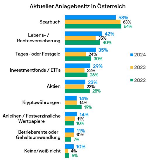 Mit 58 Prozent bleibt das Sparbuch weiter Spitzenreiter bei den Anlegern, Lebens- und Rentenversicherungen kommen auf 41Prozent Verbreitung gefolgt von Tages- und Festgeld mit 35%. Investmentfonds und ETFs konnten ihren Anteil um 7 Prozentpunkte auf 29 Prozent steigern. Die Differenz zwischen Sparbuch- sowie Investmentfonds/ETF-Besitz ist 2024 auf 29 Prozentpunkte zurückgegangen - 2022 waren es 38 Prozentpunkte Unterschied, im letzten Jahr sogar 41.