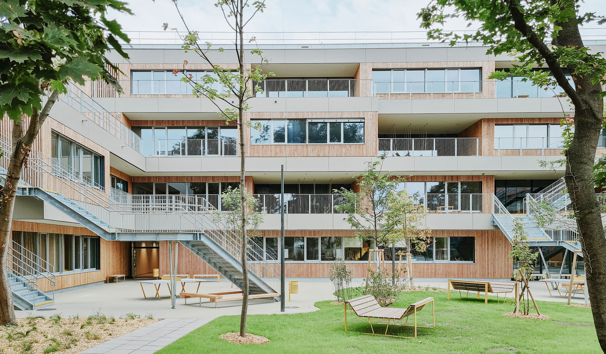 Das Gebäude zeichnet sich durch eine versetzte Anordnung der Klassenräume aus, die sich mit offenen Bereichen abwechseln. Diese Gestaltung ermöglicht eine flexible Raumnutzung und verbindet Innen- und Außenräume nahtlos. Die Kombination aus Holz und Beton sorgt für eine warme, einladende Atmosphäre. Großzügige Freiflächen wurden als Erlebnisräume für die Kinder gestaltet und durch begrünte Terrassen in den oberen Stockwerken ergänzt. Eine PV-Anlage für umweltfreundliche Energie und die Nutzung von Erdwärme durch Bauteilaktivierung tragen zur Kühlung der Räume bei.