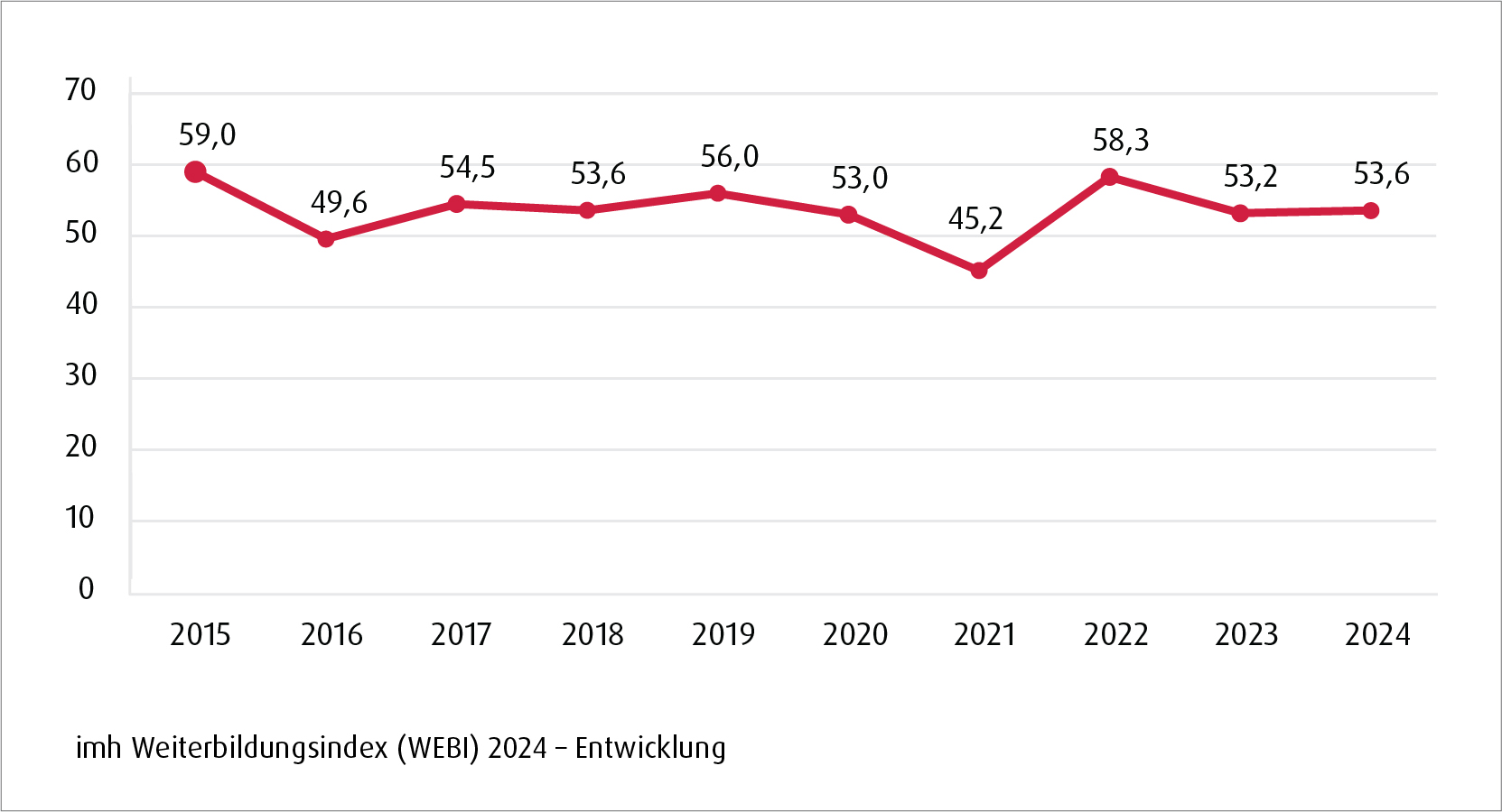 Der imh Weiterbildungsindex (WEBI) misst jährlich die Bedeutung von beruflicher Aus- und Weiterbildung in Unternehmen. Befragt werden Vertreterinnen und Vertreter der verschiedenen Hierarchieebenen aus österreichischen Unternehmen aller Branchen. Der imh Weiterbildungsindex (WEBI) 2024 hat den Wert 53,6 von 120 möglichen Punkten. Im Jahr 2023 betrug der Wert 53,2 Punkte. Zum Vergleich: Der höchste je erzielte Wert war 59,0 im Jahr 2015. Im Jahr 2019 betrug der Wert 56,0. Die Bewertungskriterien sind der Stellenwert von Weiterbildung, die Anzahl der geplanten Veranstaltungsbesuche und die Veränderung des Bildungsbudgets.