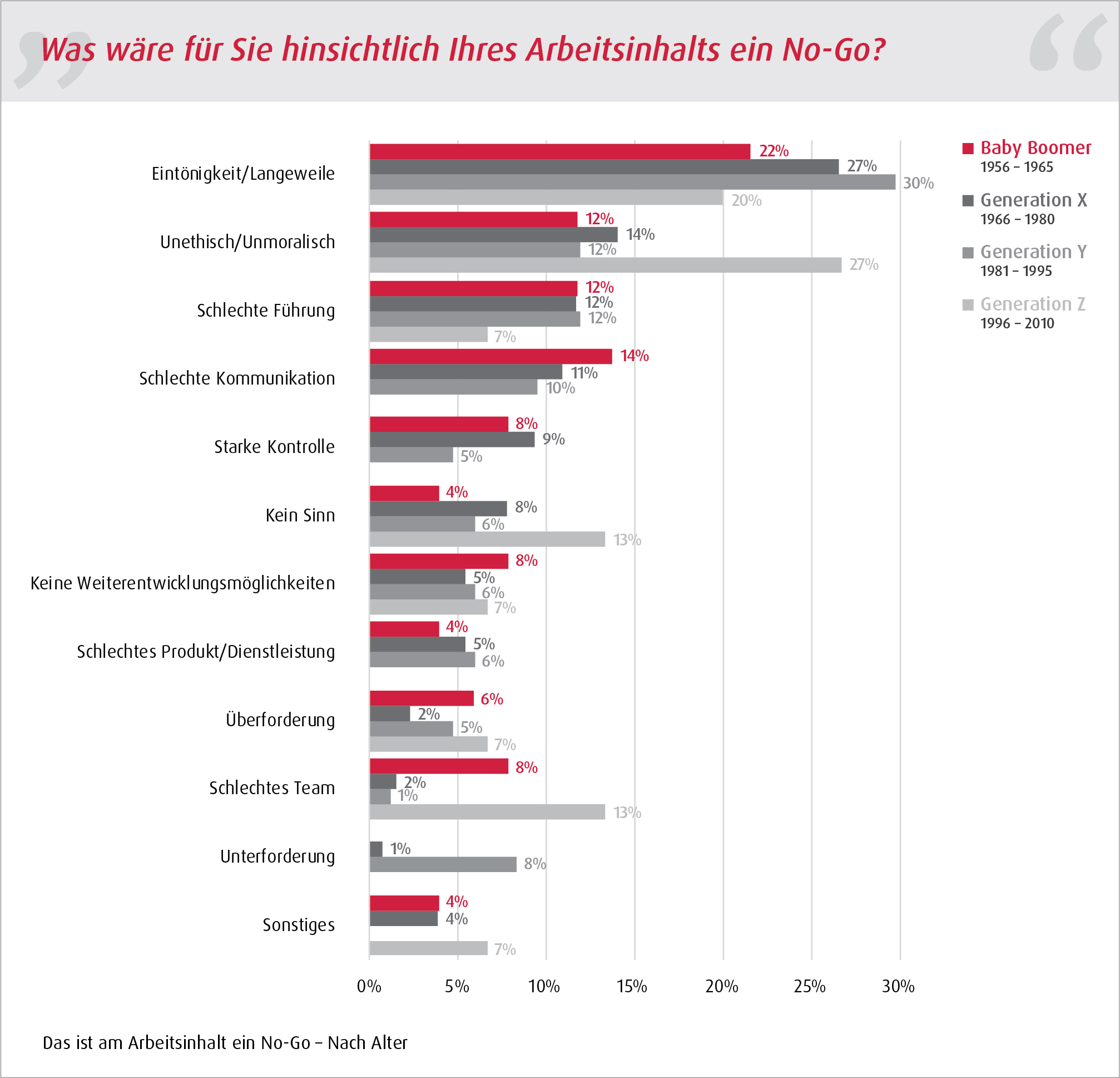 Was ist beim Arbeitsinhalt ein absolutes No-Go? Da sind sich ausnahmsweise alle Generationen (fast) einig: „Eintönigkeit und Langeweile“, das geht gar nicht. Hier reichen die Werte von 22% (Baby Boomer) über 27% (Generation X) und 30% (Generation Y). Nur die Generation Z tanzt hier aus der Reihe; da bewerten nur 20% „Eintönigkeit und Langeweile“ als ein No-Go. Für die Generation Z darf Arbeit keinesfalls „Unethisch und Unmoralisch“ sein, sagen 27%. Das finden allerdings nur 12% der Baby Boomer und der Generation Y, sowie 14% aus der Generation X.