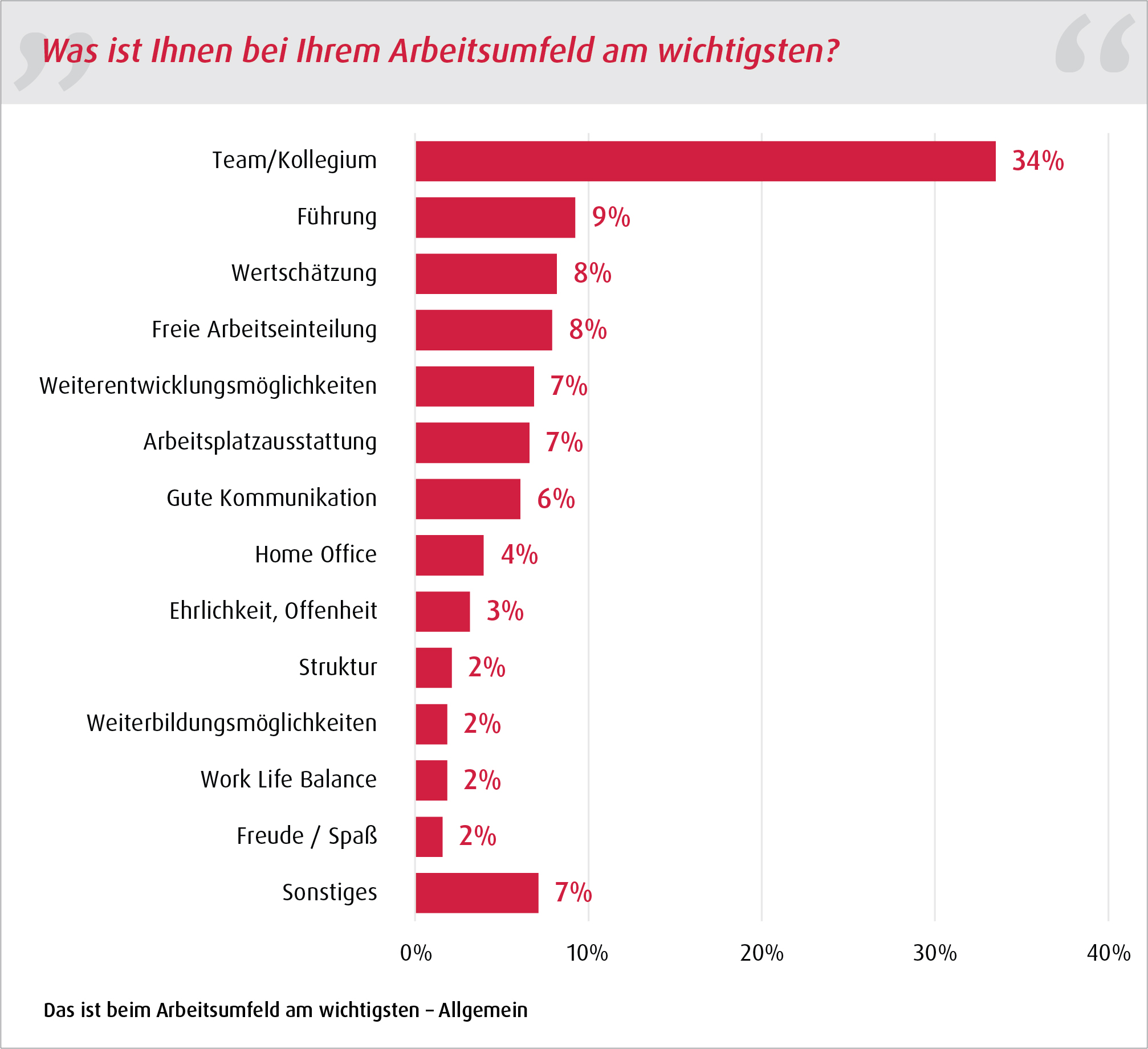 Bei der diesjährigen Studie wurde die Zusatzfrage gestellt: „Was ist Ihnen im Berufsalltag wichtiger - Arbeitsumfeld oder Arbeitsinhalt?“ Dabei ist Arbeitsumfeld definiert als Beschaffenheit des Arbeitsplatzes und die berufliche Entwicklungsmöglichkeit. Bei Arbeitsinhalt geht es um Aufgabenstellungen und die Art des Produktes oder der Dienstleistung.