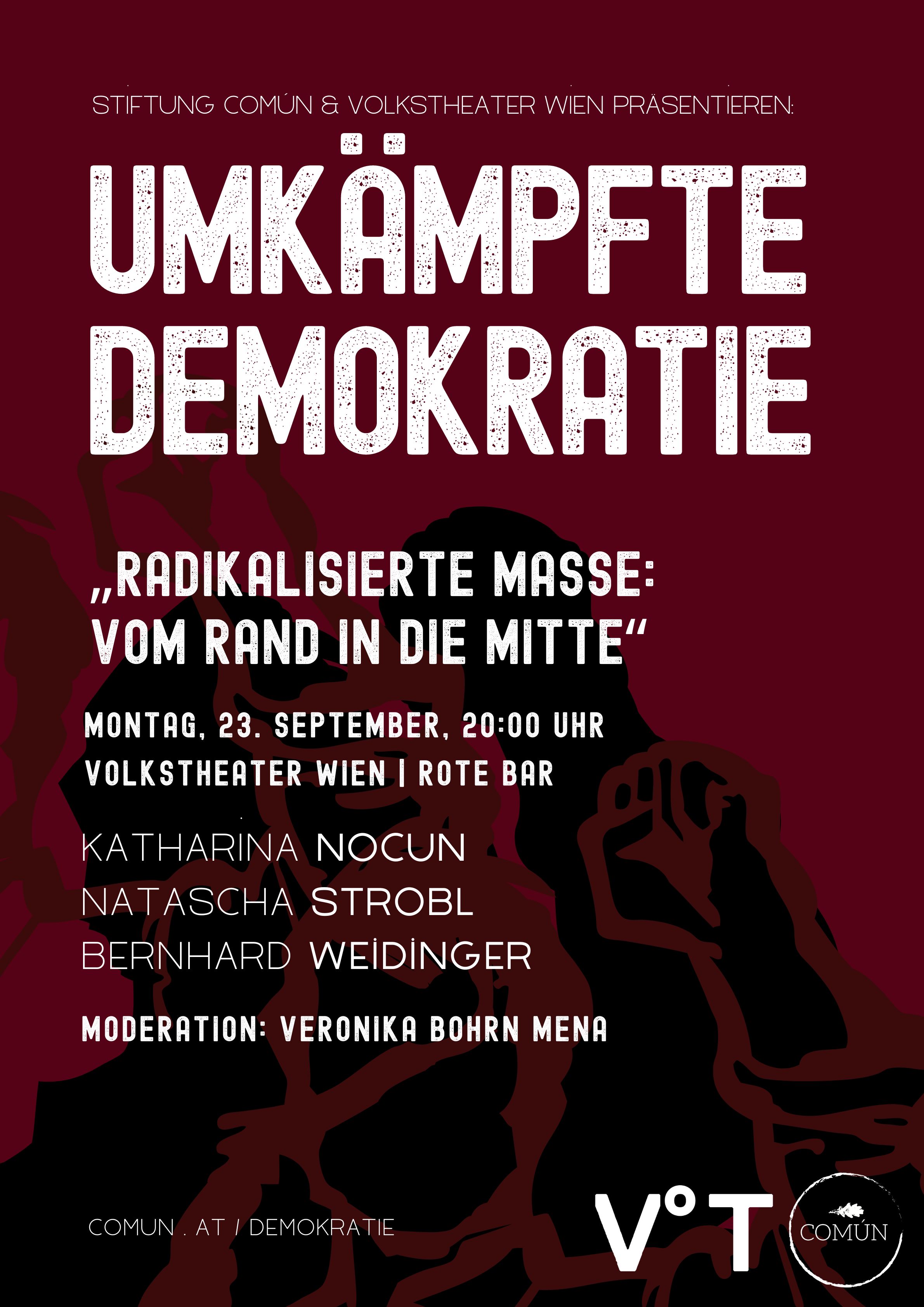 Die Auftaktveranstaltung findet am Montag, den 23. September 2024 um 20:00 Uhr in der Roten Bar im Volkstheater statt, es stehen dafür genau 99 Tickets zum Preis von je 15 Euro zur Verfügung. Der Reinerlös fließt in den „Gegenrechtsschutz“ der Stiftung COMÚN, mit dem Aktivitäten zur Abwehr von Angriffen von Rechten finanziert werden. Mehr Informationen zu den weiteren Terminen unter comun.at/demokratie.