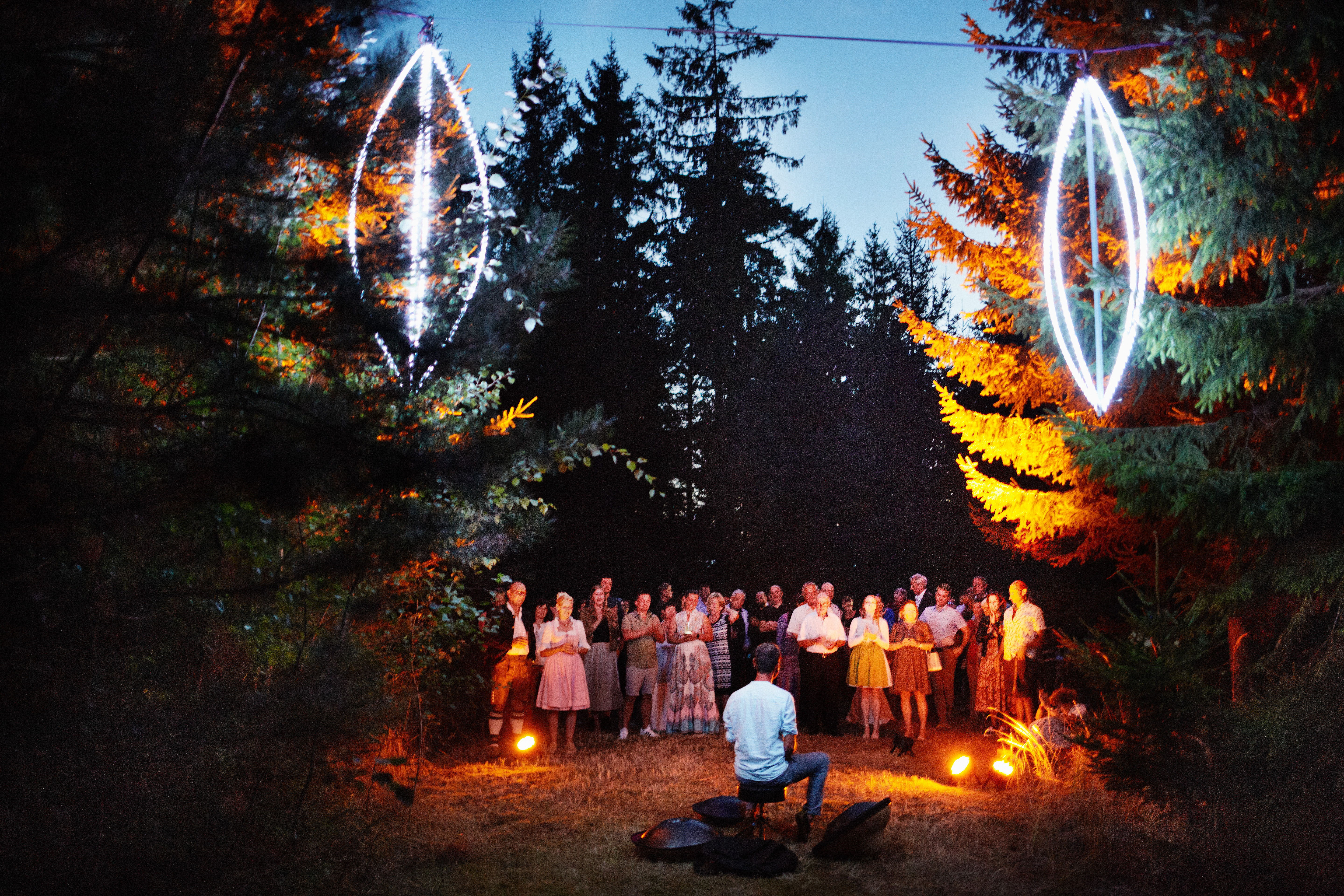 Das krönende Highlight dieses Abends waren die Lichtinstallationen von Leo Bettinelli. Der gebürtige Argentinier und Wahl-Waldviertler liebt es, mittels Lichtinstallation die Geister des Waldes zwischen Felsen, Moos und Bäumen tanzen zu lassen. Er schaffte so eine mystische Stimmung, die ganz besonders gut zu diesem Abend passte - eine Symbiose aus Natur, Kunst und Kulinarik. Musikalisch umrahmt wurde das Licht-Spektakel von den eindrucksvollen Hand-Pan-Klängen von Johannes J. Kronegger.