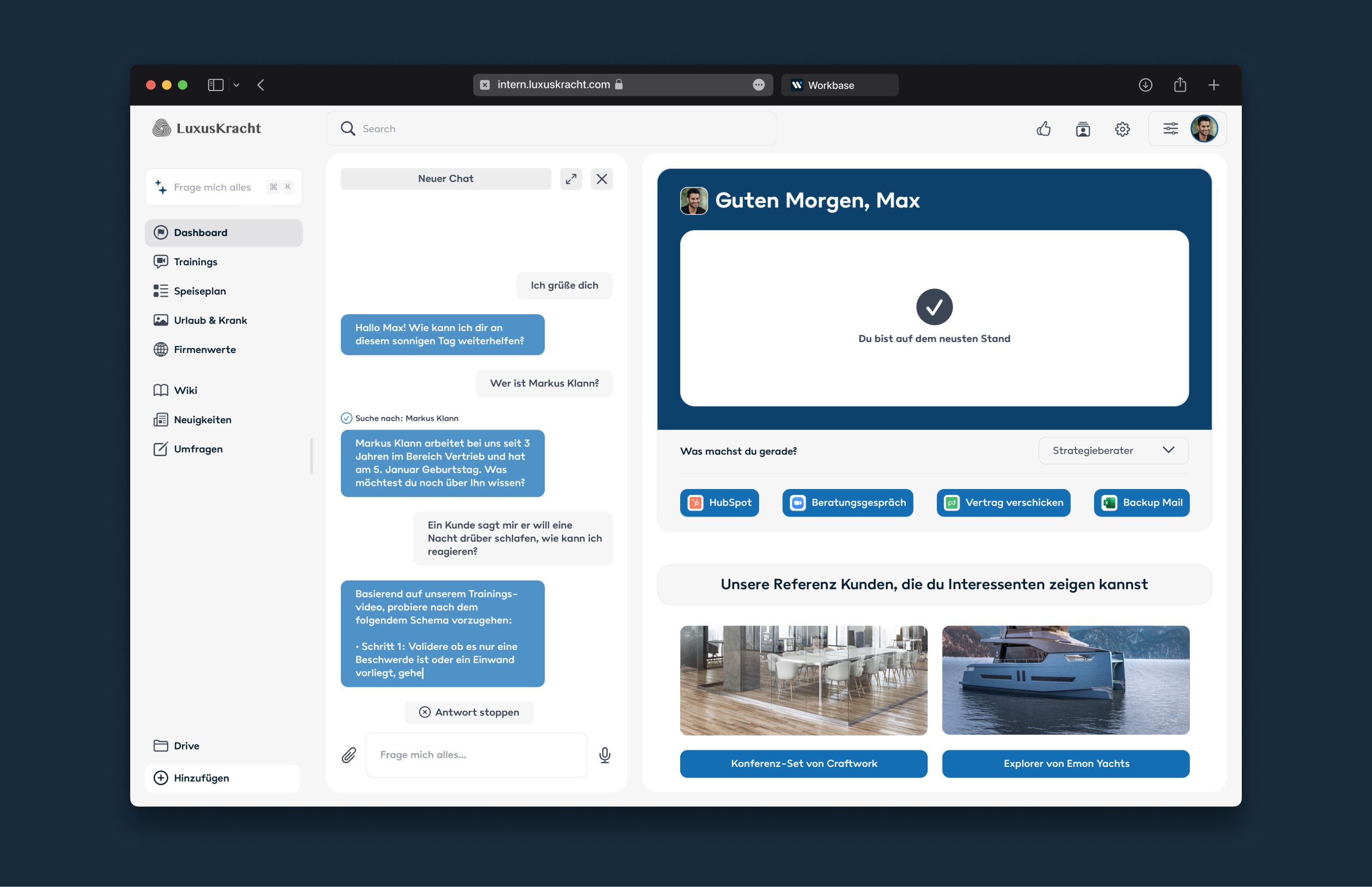 - Automatisiertes Wissen: Der Assistent durchsucht deine gespeicherten Dokumente, Schulungsvideos und internen Datenbanken, um den Mitarbeitern jederzeit relevante und genaue Informationen zu liefern. Dadurch wird die Effizienz im gesamten Unternehmen spürbar gesteigert.