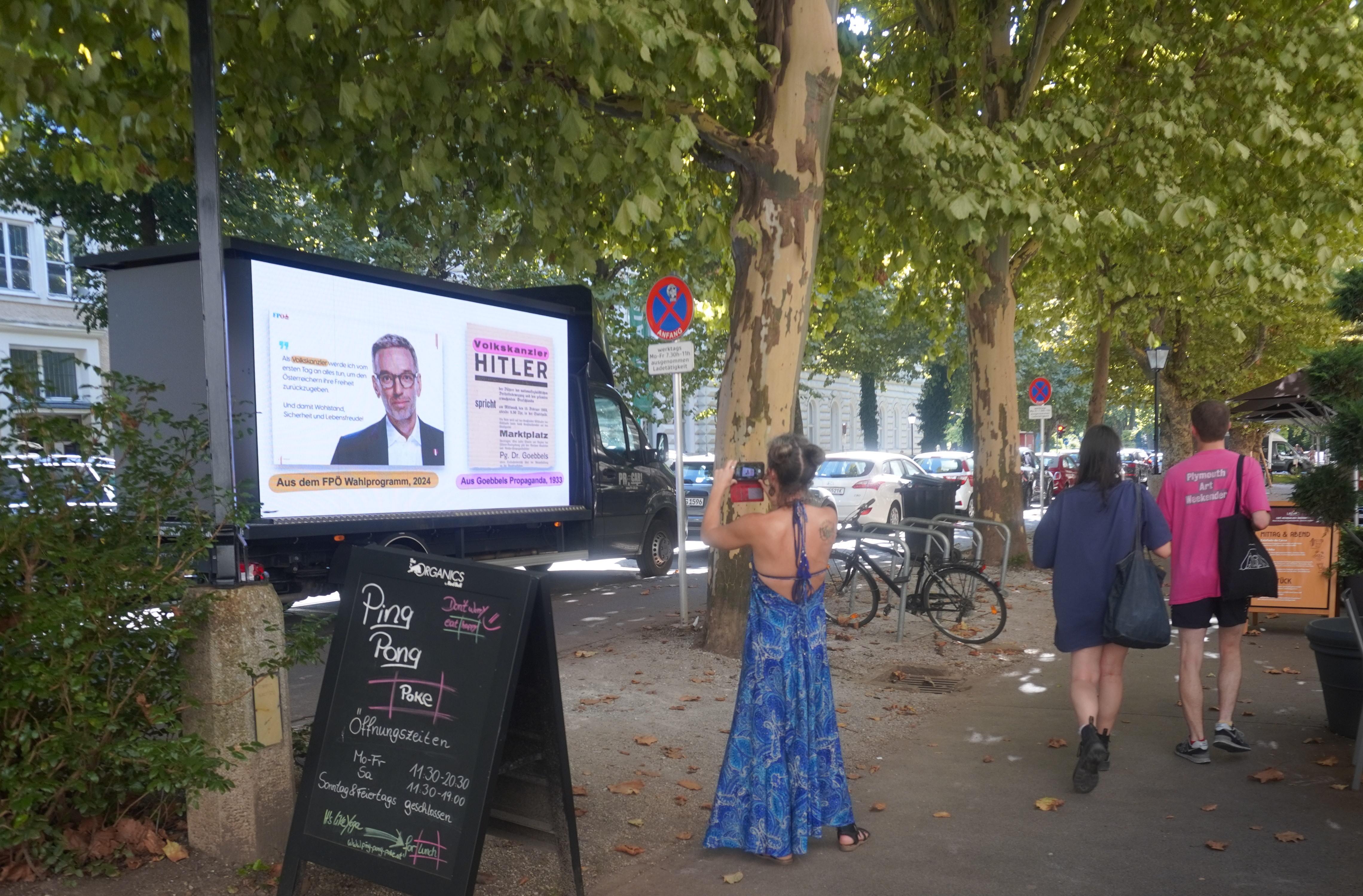 Die überparteiliche Plattform Demokratie Österreich tourt seit nunmehr einer Woche durch das Land und informiert über den antidemokratischen Hintergrund des Begriffs „Volkskanzler“, mit dem sich FPÖ-Obmann Herbert Kickl seit geraumer Zeit selbst bezeichnet. Im Mittelpunkt der Tour steht dabei ein mobiler Großbildschirm, der auf öffentlichen Plätzen kurze Aufklärungsvideos zum Thema zeigt, die allerorts auf großes Interesse stoßen. Die „Aufklärungstour“ begann am 5. September vor dem Bundeskanzleramt und ist derzeit - nach Stationen in Wien, Linz, Salzburg und Innsbruck - unterwegs in den Südosten Österreichs.