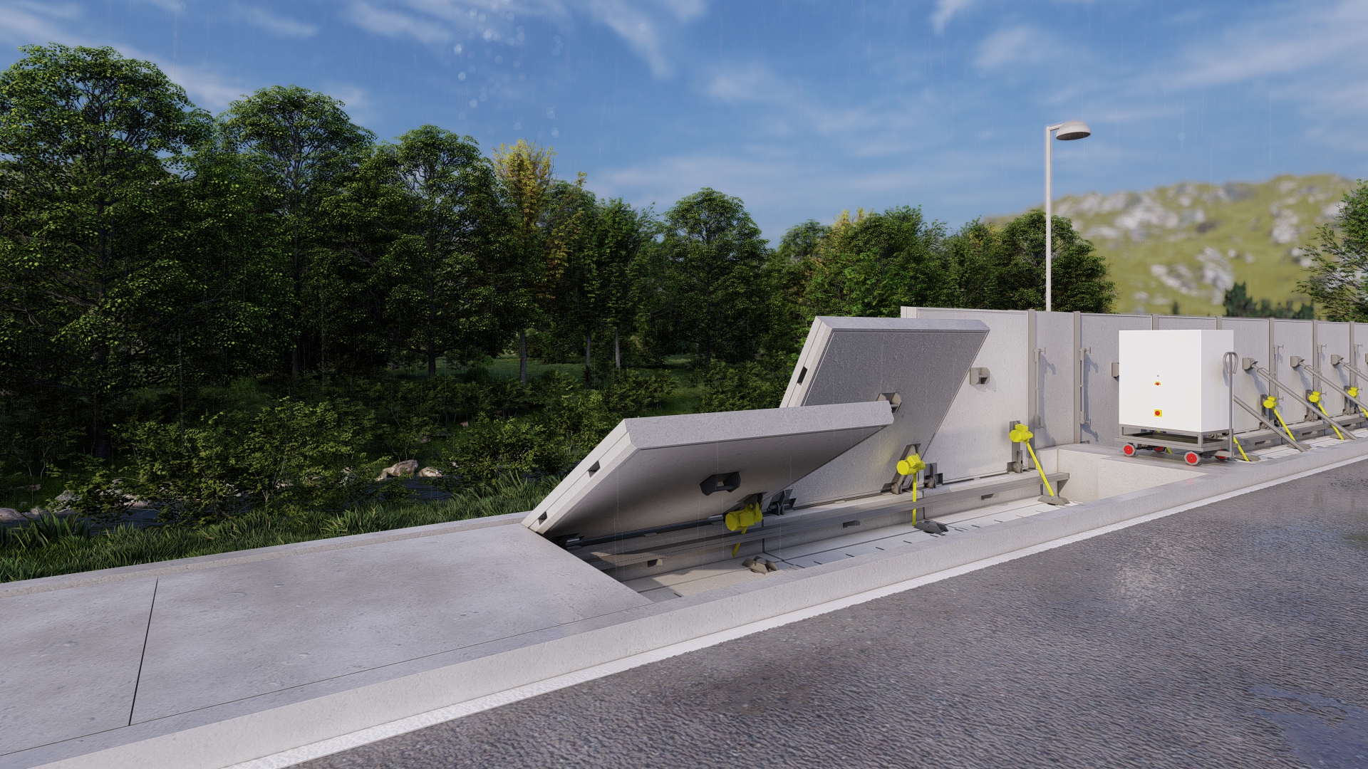 GWF Flood Protection hat ein innovatives System entwickelt, das Geh- und Radwege, aber auch Zu- und Einfahrten in Hochwasserbarrieren verwandelt. Das System basiert auf Stahlbetonfertigteilen, die durch einen elektrisch oder manuell betriebenen Hubspindelantrieb aufgestellt werden. So können wenige Personen innerhalb kürzester Zeit auf einmal bis zu 50 Meter Barriere aktivieren - eine Lösung, die wertvolle Zeit und Ressourcen spart.