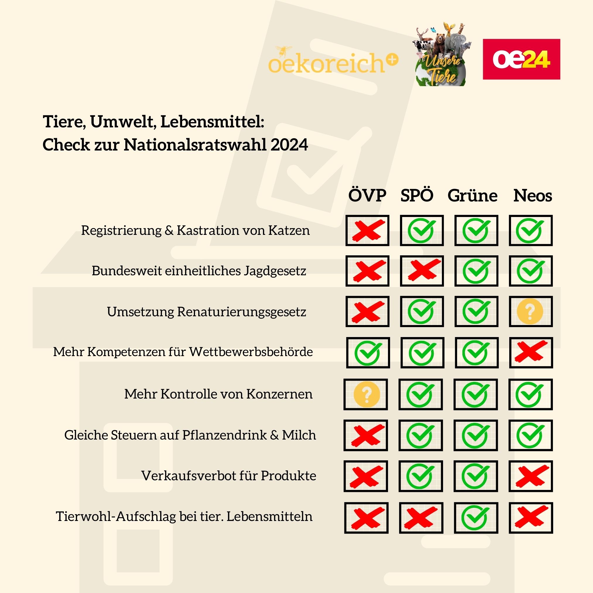 Initiative oekoreich und oe24 haben Parteien nach Positionen befragt, ÖVP, SPÖ & Co mit Antworten zu u.a. Vollspaltenböden, Wolf, Renaturierung und Verkaufsverboten