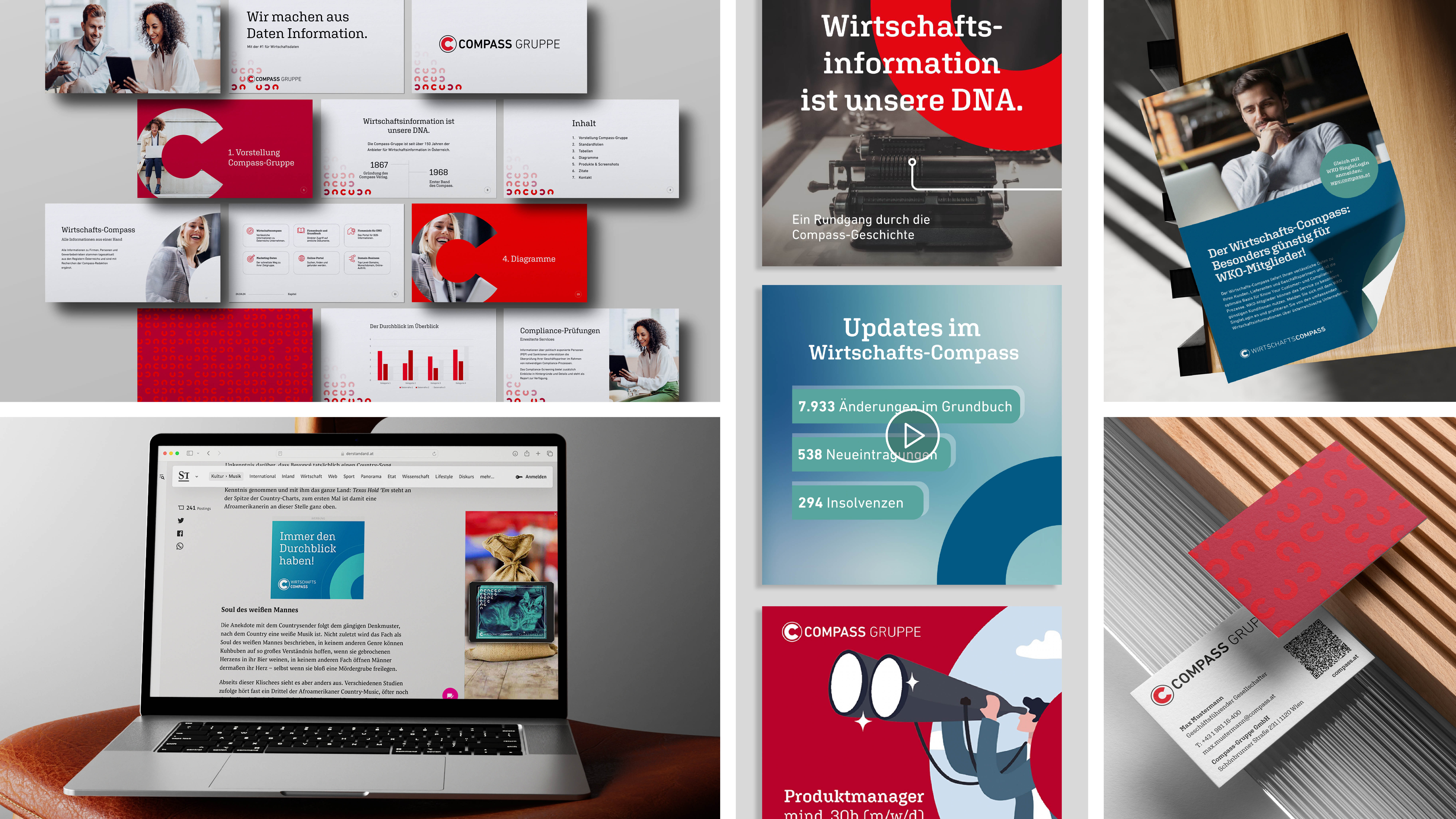 Das Rebranding umfasst den gesamten Online- und Social-Media-Auftritt der Compass-Gruppe und des Wirtschafts-Compass, sowie Print-Sujets, Werbemittel und Drucksorten.