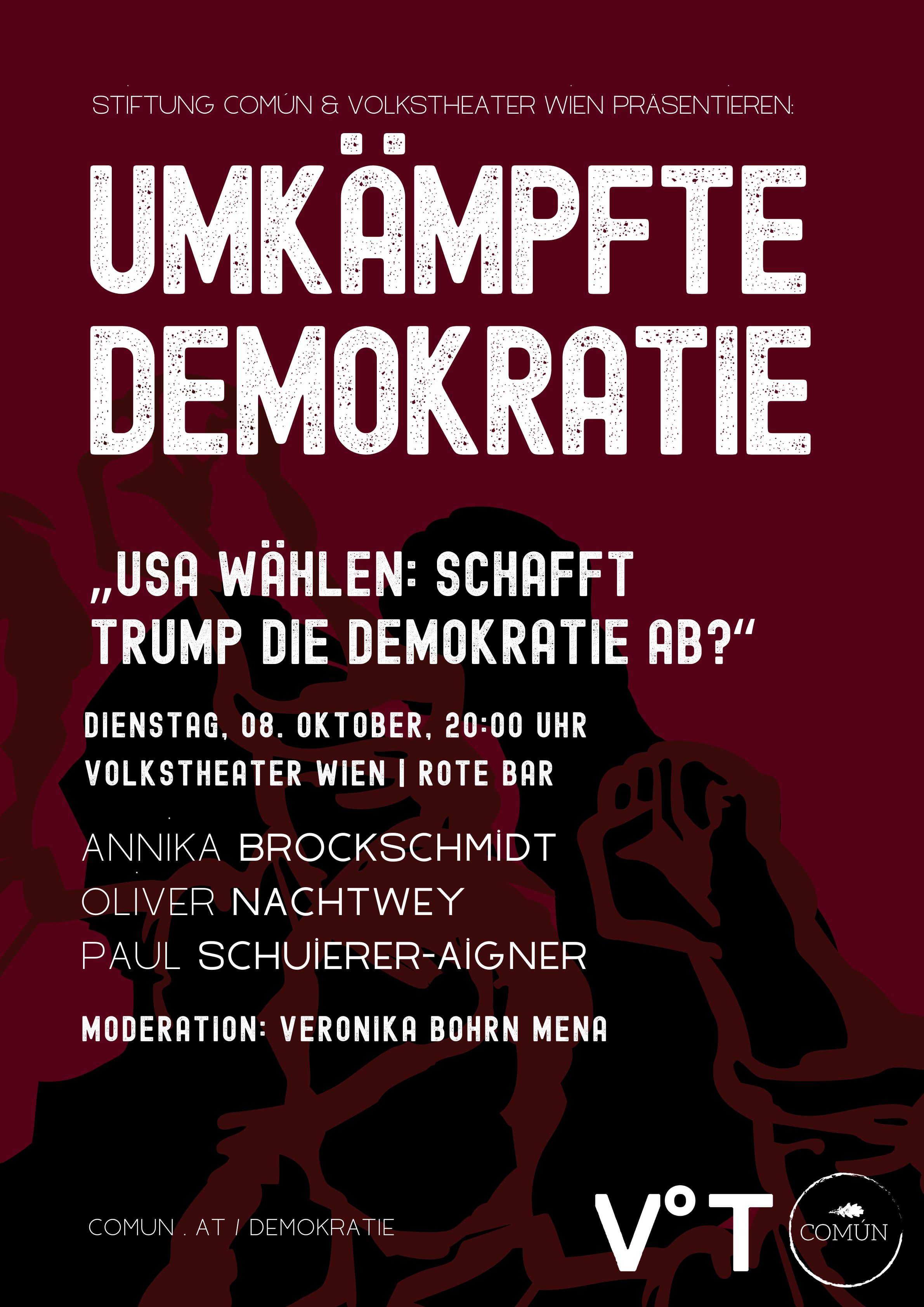 Die Stiftung COMÚN widmet sich in der zweiten Veranstaltung ihrer Reihe „Umkämpfte Demokratie“ in und mit dem Volkstheater Wien dem Wahlkampf in den USA und seinen Verbindungen zum Aufstieg von Rechtsextremen in Österreich & Deutschland. Zu Gast sind Journalistin & Autorin Annika Brockschmidt (u.a. „Amerikas Gotteskrieger“) und der Ökonom & Autor Oliver Nachtwey (u.a. „Die Abstiegsgesellschaft“).