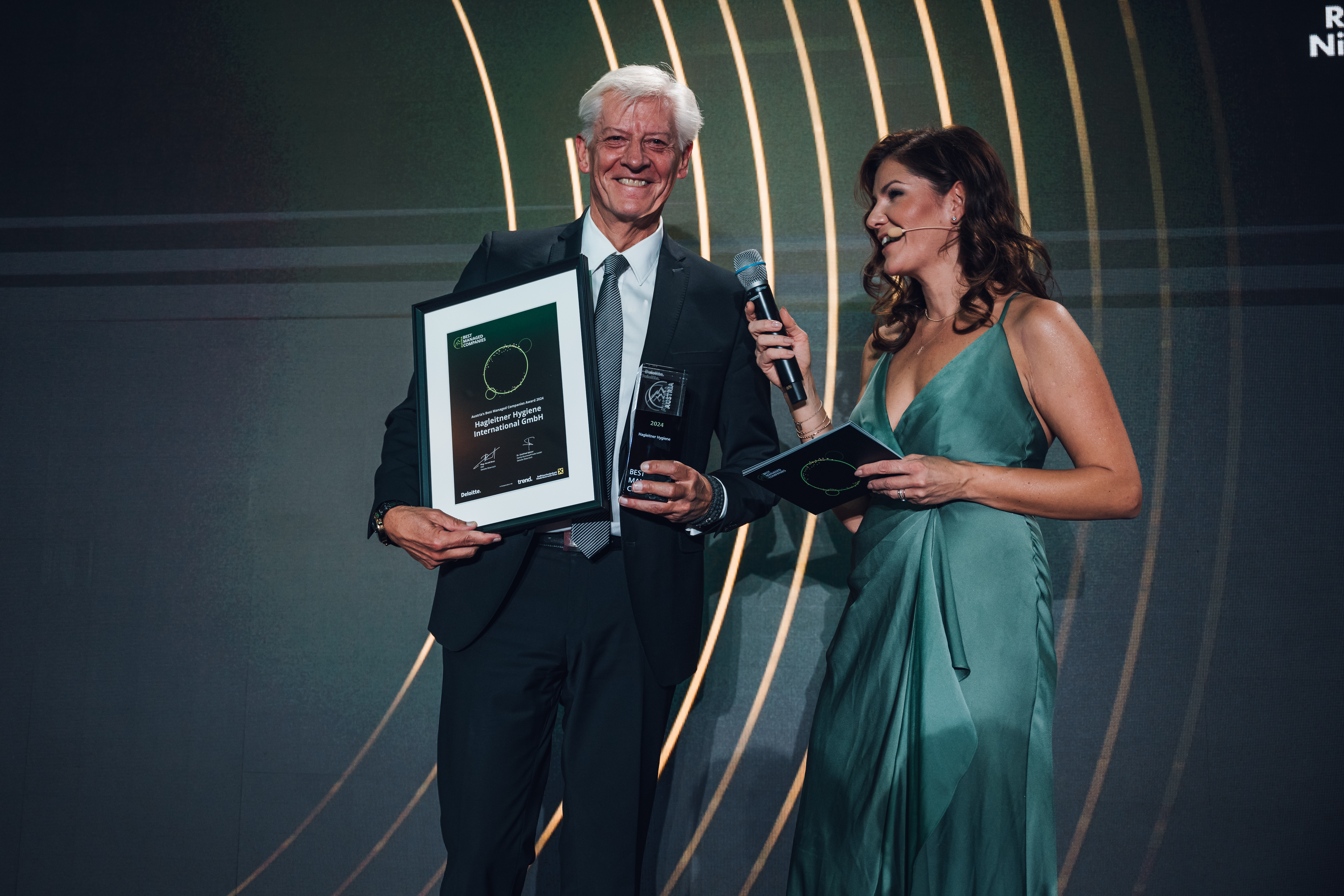 Bühne frei für bestgeführte Firmen hieß es am 2. Oktober 2024, Schauplatz war Wien: Deloitte Österreich hat 22 Unternehmen ausgezeichnet, hierzu gehört Hagleitner. Der Hygienehersteller reiht sich 2024 unter Austria’s Best Managed Companies. So erklärt die Jury ihre Wahl: „Mit Hagleitner sind wir auf ein Salzburger Unternehmen gestoßen, das hervorragend aufgestellt ist. Speziell die Fertigungstiefe am Standort in Zell am See sowie die Innovationskraft haben uns beeindruckt. Die Firmenphilosophie zeugt zudem von hoher regionaler und sozialer Verantwortung.