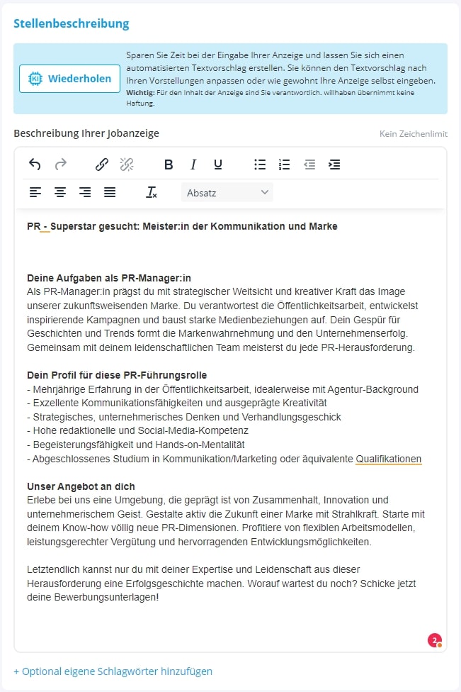 - Schnell und einfach neue MitarbeiterInnen finden: willhaben-KI-Tool erstellt auf Basis des Jobtitels binnen weniger Sekunden eine professionelle, anpassbare Stellenbeschreibung