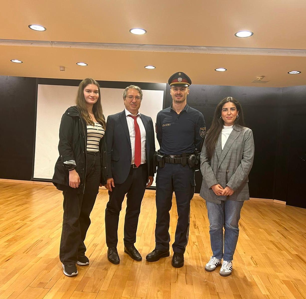 Im Gegensatz zu den vorherigen Treffen, die in einem kleineren Rahmen stattfanden, wurde dieses Mal die Veranstaltung in unserem großen Konferenzsaal abgehalten. Die Polizei präsentierte informative Vorträge zu Themen wie Gewalt in der Privatsphäre, Verkehrssicherheit, den Voraussetzungen für den Polizeiberuf und dem Schutz von Jugendlichen. Diese Präsentationen boten den Teilnehmern tiefere Einblicke und stießen auf großes Interesse, insbesondere bei den jungen Besuchern, die aktiv an den Diskussionen teilnahmen.