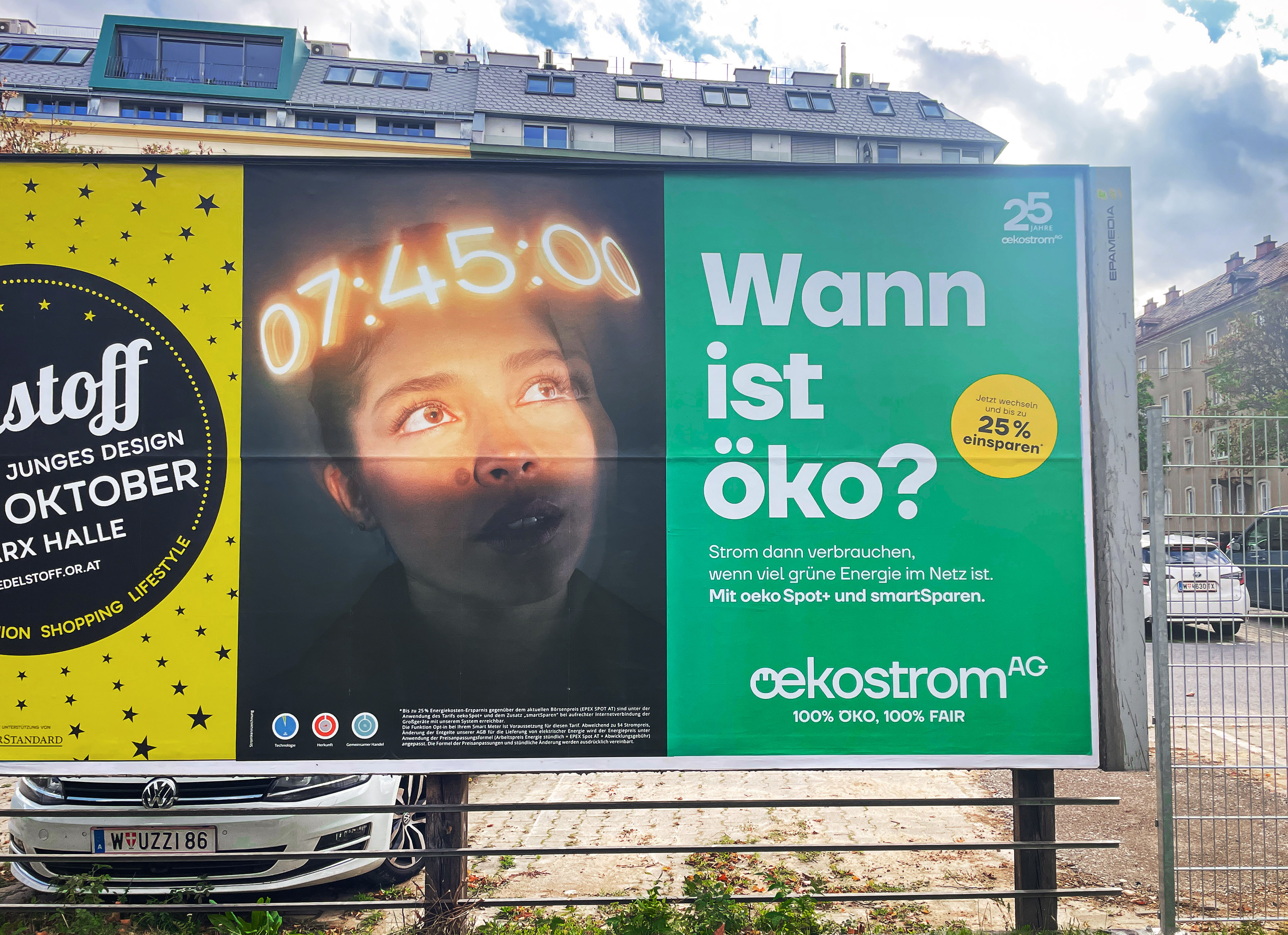 Mit der aktuellen Kampagne „Wann ist öko?“ zeigt die oekostrom AG einmal mehr, das innovative Stromprodukte nicht kompliziert sein müssen. Die Kampagne verdeutlicht, dass es notwendig ist, Strom dann zu verbrauchen, wenn er günstig ist, und liefert auf die gestellte Frage ‚Wann?‘ gleich die Antwort. Öko ist dann, wenn viel grüne Energie im Netz verfügbar ist. Mit dem beworbenen ersten smarten Stromtarif „oeko Spot+“ der oekostrom AG lässt sich genau das nutzen. Wer seine Geräte zu Zeiten betreibt, in denen viel saubere Energie vorhanden ist, kann mit der „smartSparen“-Option bis zu 25 % Stromkosten sparen.