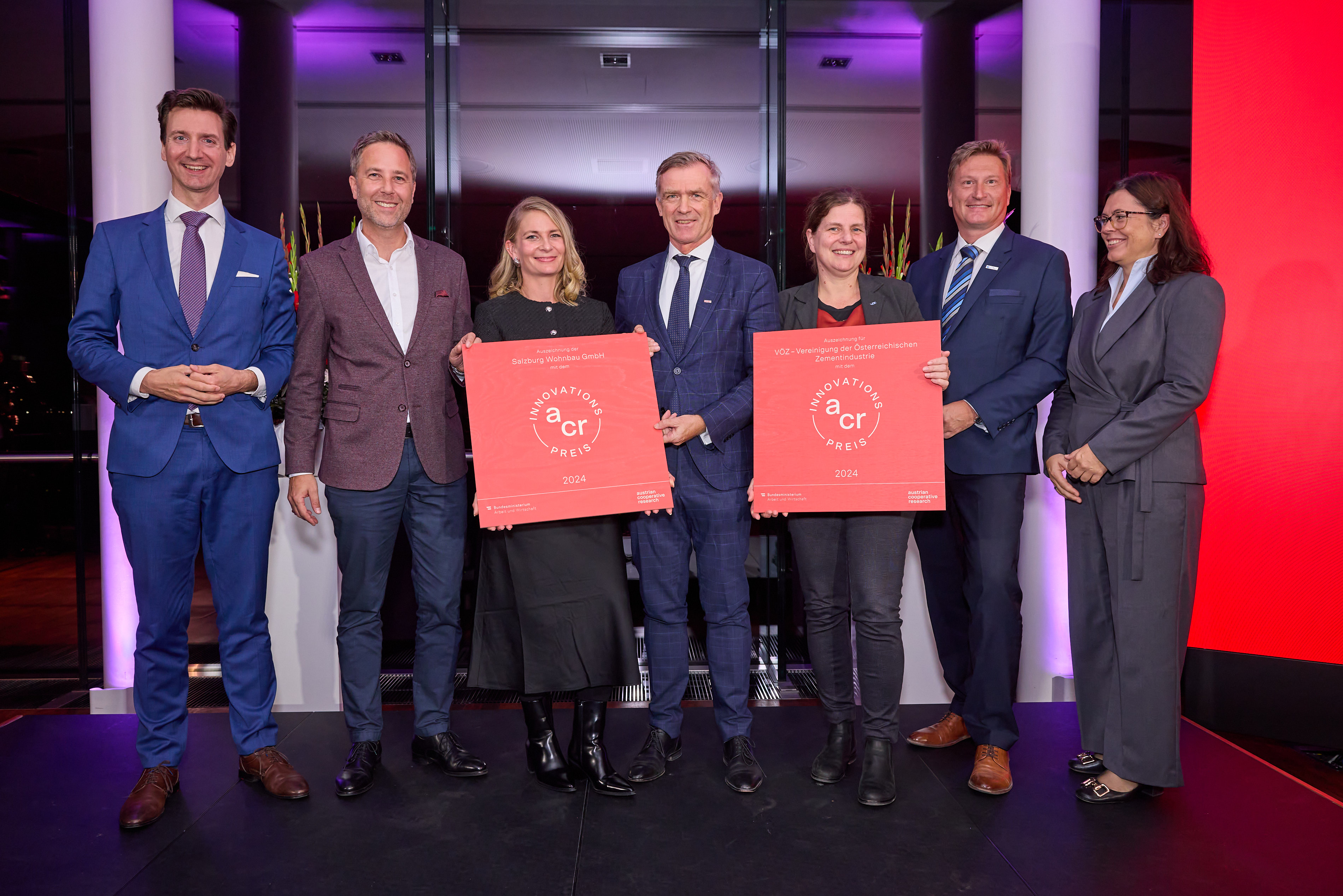 Jedes Jahr holt die ACR - Austrian Cooperative Research zusammen mit dem Bundesministerium für Arbeit und Wirtschaft (BMAW) KMU-Innovationen vor den Vorhang. Für die Entwicklung einer klimafitten Zementsorte wurden die Vereinigung der Österreichischen Zementindustrie (VÖZ) und die Salzburg Wohnbau GmbH mit dem ACR-Innovationspreis 2024 ausgezeichnet.