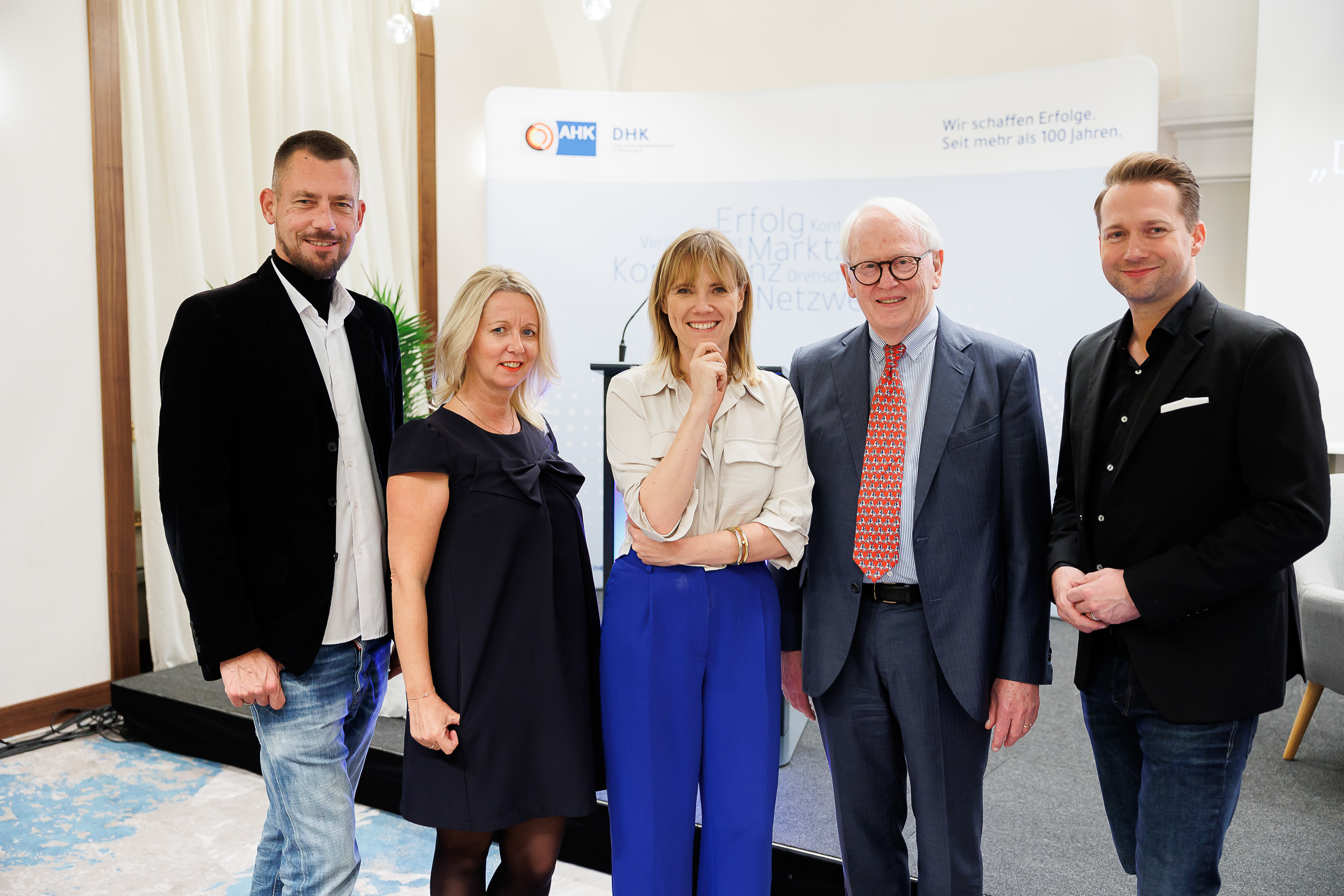 In der anschließenden Podiumsdiskussion unter der Moderation von Kathrin Gulnerits kritisierte Rainer Will, Geschäftsführer des österreichischen Handelsverbandes, den unfairen Wettbewerb durch chinesische Anbieter, die „de facto eine von der EU subventionierte Müllspur durch die Welt“ zögen, um die breite Masse der Konsumenten mit Scheinangeboten zu ködern. Markus Kuntke, Trend- und Innovationsmanager der REWE International AG, wies darauf hin, dass das Thema Vertrauen in den Händler vor allem für die jüngere Generation immer wichtiger werde. Im Rahmen der strengen EU-Regulierungen können Daten aber auch genutzt werden, um den Kundenbedürfnissen nach Individualisierung und Personalisierung gerecht zu werden. Werner M. Bahlsen, Executive Chairman, Bahlsen Group/Bahlsen GmbH & Co KG, betonte in der Diskussion, dass Tradition die Basis für Innovation sei. "Es ist wichtig, neugierig zu bleiben“, so Bahlsen, der an diesem Abend für seine 60-jährige Mitgliedschaft in der DHK geehrt wurde.