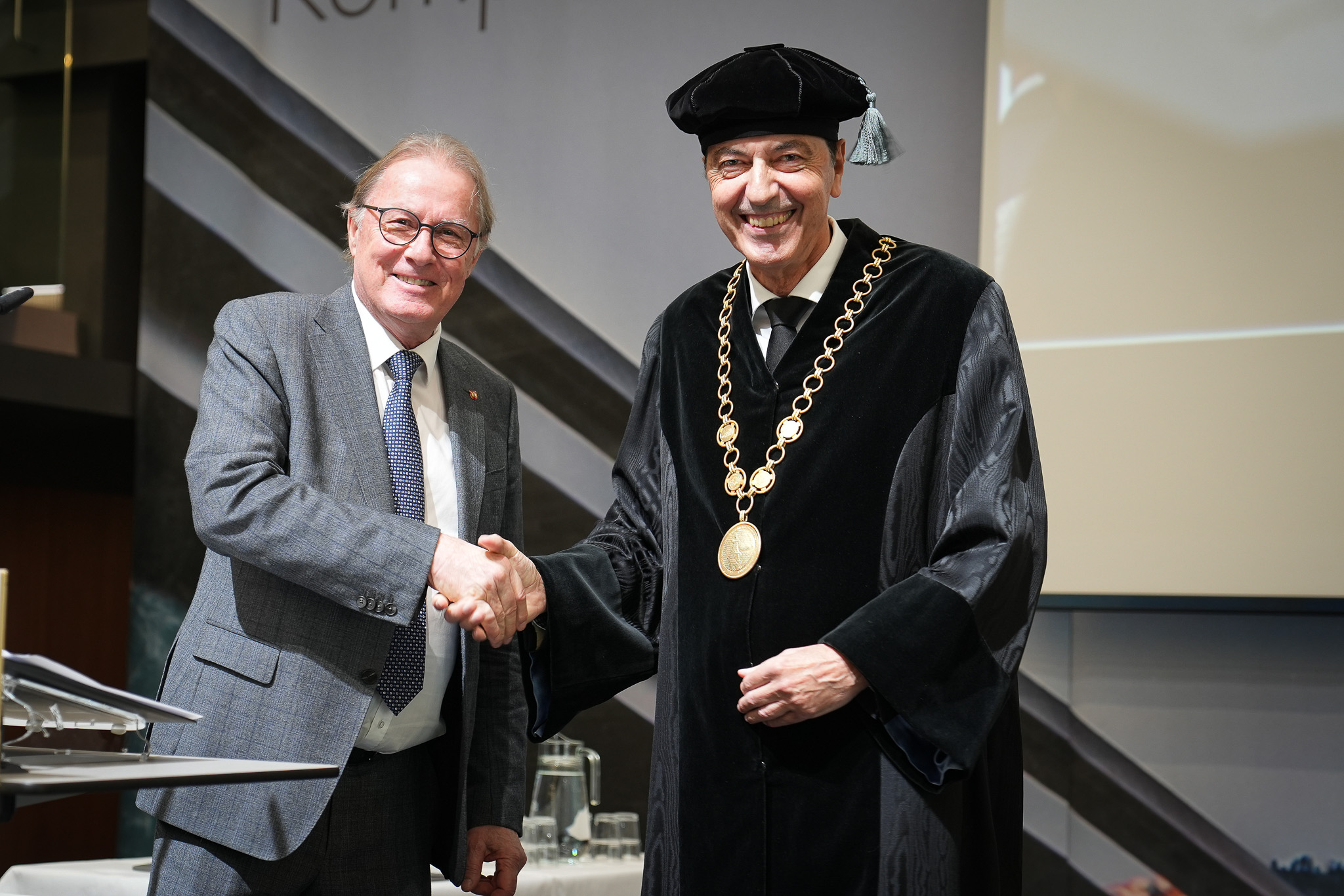 Auch der Bürgermeister der Stadt Hall in Tirol, Dr. Christian Margreiter, gratulierte den Absolventinnen und Absolventen zu ihrem Studienabschluss. Zum 20jahr Jubiläum der Universitätsstadt Hall stellte er fest, dass Bildung für die gesellschaftliche Entwicklung und die Gesellschaft essentiell sei. „Hall in Tirol ist eine Bildungsstadt. Dass wir jetzt inzwischen schon seit 20 Jahren Heimat für eine Universität sind, macht uns stolz. Abseits von den positiven wirtschaftlichen Auswirkungen für die Stadt freut es uns aber ganz besonders, dass Forschungsarbeiten, die auf Haller Boden entstanden sind, die nationale und internationale Wissenschaft bereichern und dass die Absolventinnen und Absolventen, die hier in Hall ausgebildet wurden, mit ihrer Expertise in wissenschaftlichen Einrichtungen, im Gesundheitswesen, in der Wirtschaft und in unterschiedlichsten Positionen weit über Hall hinaus tätig sind“.