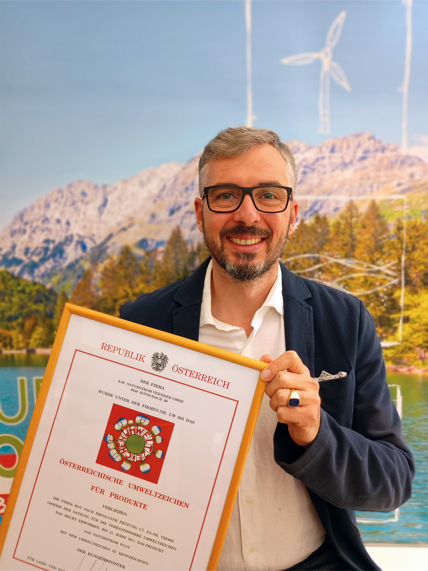 „Wir sind sehr stolz, dass wir schon seit 2003 Träger des Umweltzeichens ,Grüner Strom‘ sind“, so AAE Naturstrom-Geschäftsführer Wilfried Johann Klauss.