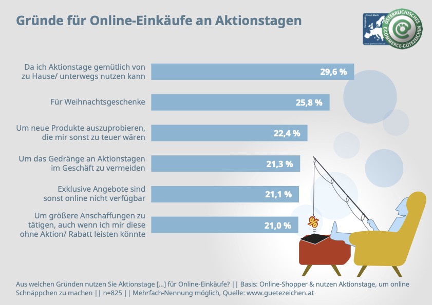 Vor allem in den kalten Jahreszeiten ist Online-Shopping besonders beliebt. Für ein Drittel der Österreicherinnen und Österreicher ist das bequeme Einkaufen von zu Hause aus, der Hauptgrund, warum E-Commerce genutzt wird (30%). Viele nutzen die „Schnäppchentage“ besonders für den Weihnachtseinkauf (26%) oder wollen das Gedränge im Geschäft vermeiden (21%).