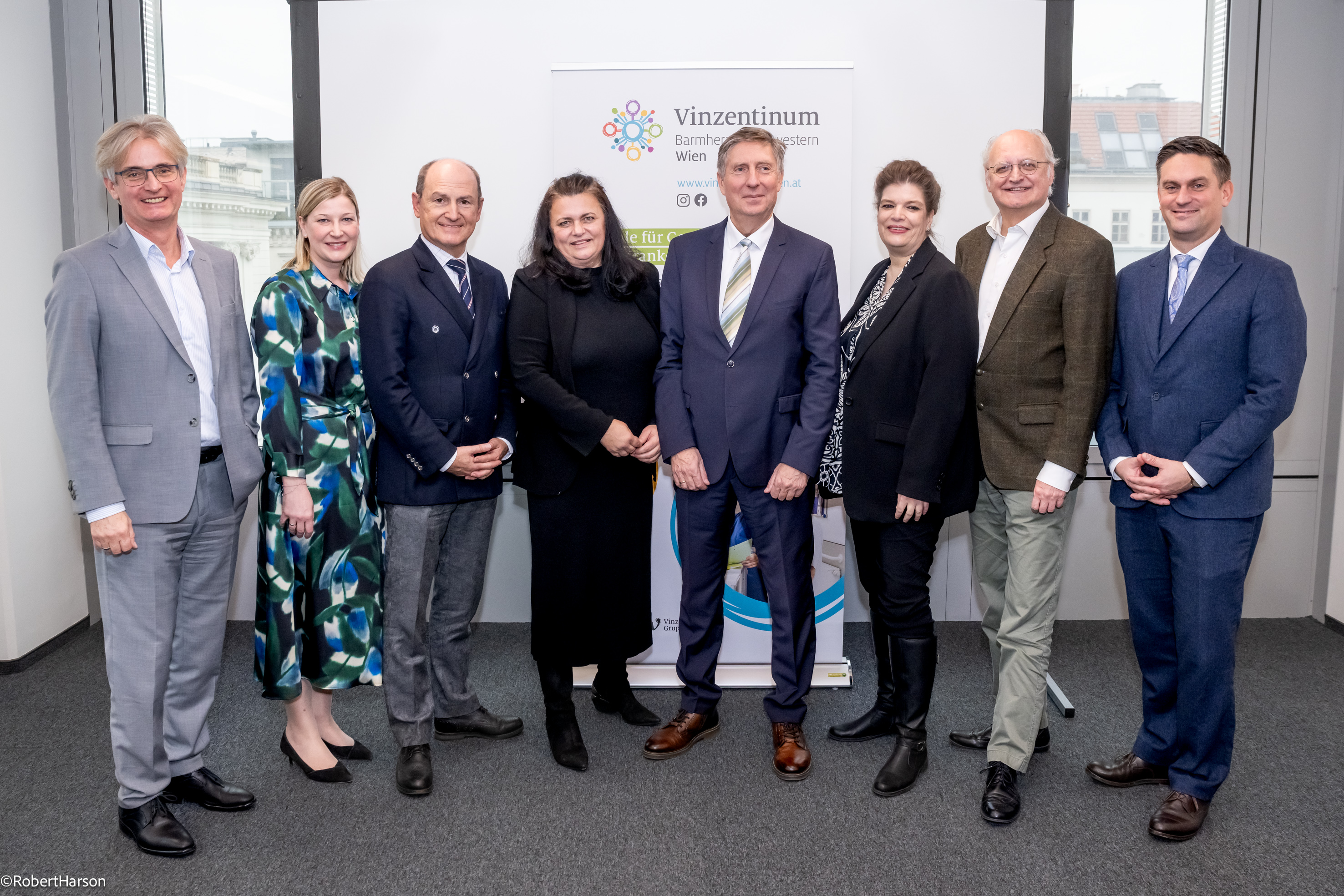 (v.l.n.r.) Mag. Stephan Lampl (Geschäftsführer der Vinzenz Gruppe), Susanne Kiss, BScN (Stellvertretende Direktorin des Vinzentinum Wien), Senatsrat Mag. Richard Gauss (Leiter MA 24-Strategische Gesundheitsversorgung, Bereichsleiter für Finanzmanagement der Geschäftsgruppe Soziales, Gesundheit und Sport sowie Geschäftsführer Wiener Gesundheitsfonds), Birgit Weinrich, MSc (Stellvertretende Direktorin des Vinzentinum Wien), Thomas Pavek (Geschäftsführer des Barmherzige Schwestern Krankenhaus Wien), Dr. Esther Matolycz (Direktorin des Vinzentinum Wien), Mag. Jan Pazourek (Büroleiter des Dachverbandes der Österreichischen Sozialversicherung) und Dr. Alexander Burz (Büroleiter-Stellvertreter des Dachverbandes der Österreichischen Sozialversicherung)