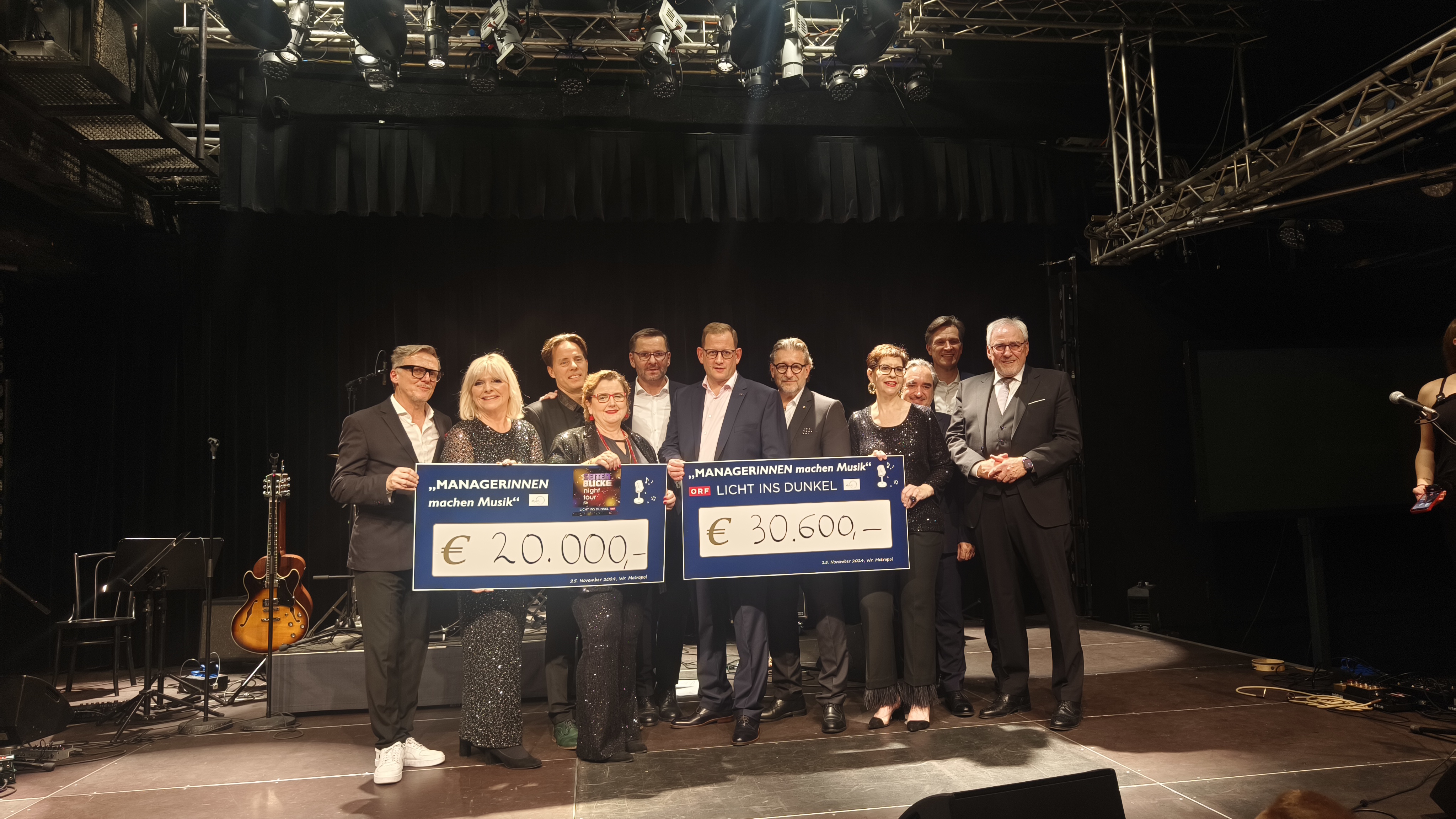 Bereits zum achtzehnten Mal fand Montagabend im Wiener Metropol die Charity-Veranstaltung „Manager:innen machen Musik“ statt. Die Initiatoren Thomas Zanyath (Versicherungsbüro Team Zanyath und Erfinder der Eventserie) und Christine Marek (CM Consulting) hatten zu einem unterhaltsamen Abend für den guten Zweck geladen. Freilich auch diesmal mit tatkräftiger Unterstützung von Freunden wie Manfred Bartalszky (Wiener Städtische Versicherung), Thomas Berghammer, Martin Brodey (DORDA Rechtsanwälte), MiJa Chun (Akakiko) mit Hong IL, Werner Fischl (PremiQaMed), Martin Himmelbauer (Himmelpower Communications), Peter Kleemann (Flughafen Wien), Ernst Machart (Wipark), Peter Pansky (prefect media), Lukas Pohl (Haus der Barmherzigkeit Gruppe), Eva Radinger (CliniClowns), Angela Walter-Gruber (ORF) und Susanne Wilding (Neurologisches Rehabilitationszentrum Rosenhügel). Peter Hofbauer stellte sein Theater Metropol zum Selbstkostentarif zur Verfügung und steuerte auch eine musikalische Einlage bei. Für die professionelle Umsetzung und überaus gelungene Arrangements sorgten einmal mehr Clemens Schaller & Band, Musicalstar Lukas Perman führte charmant durch den Abend.