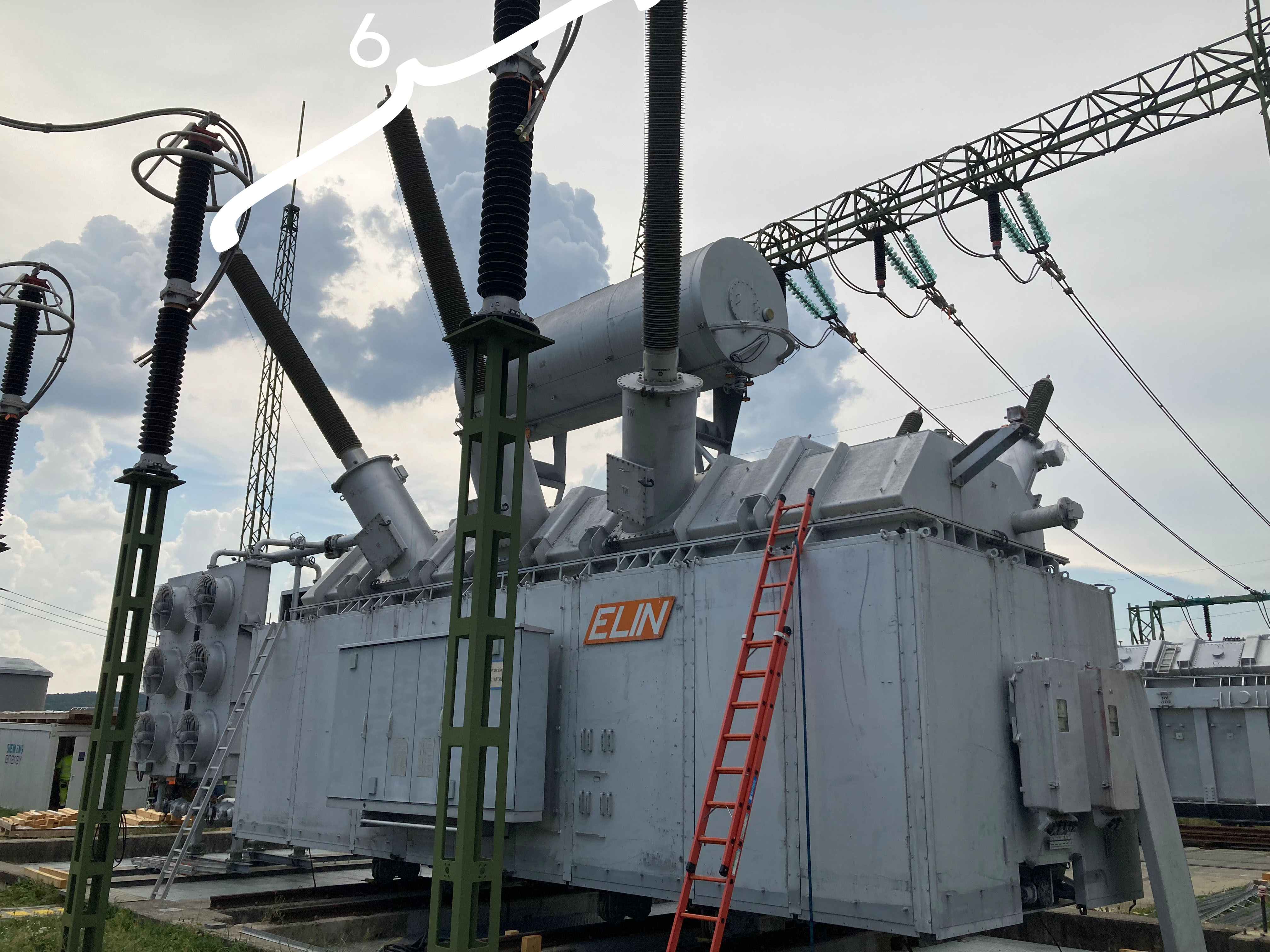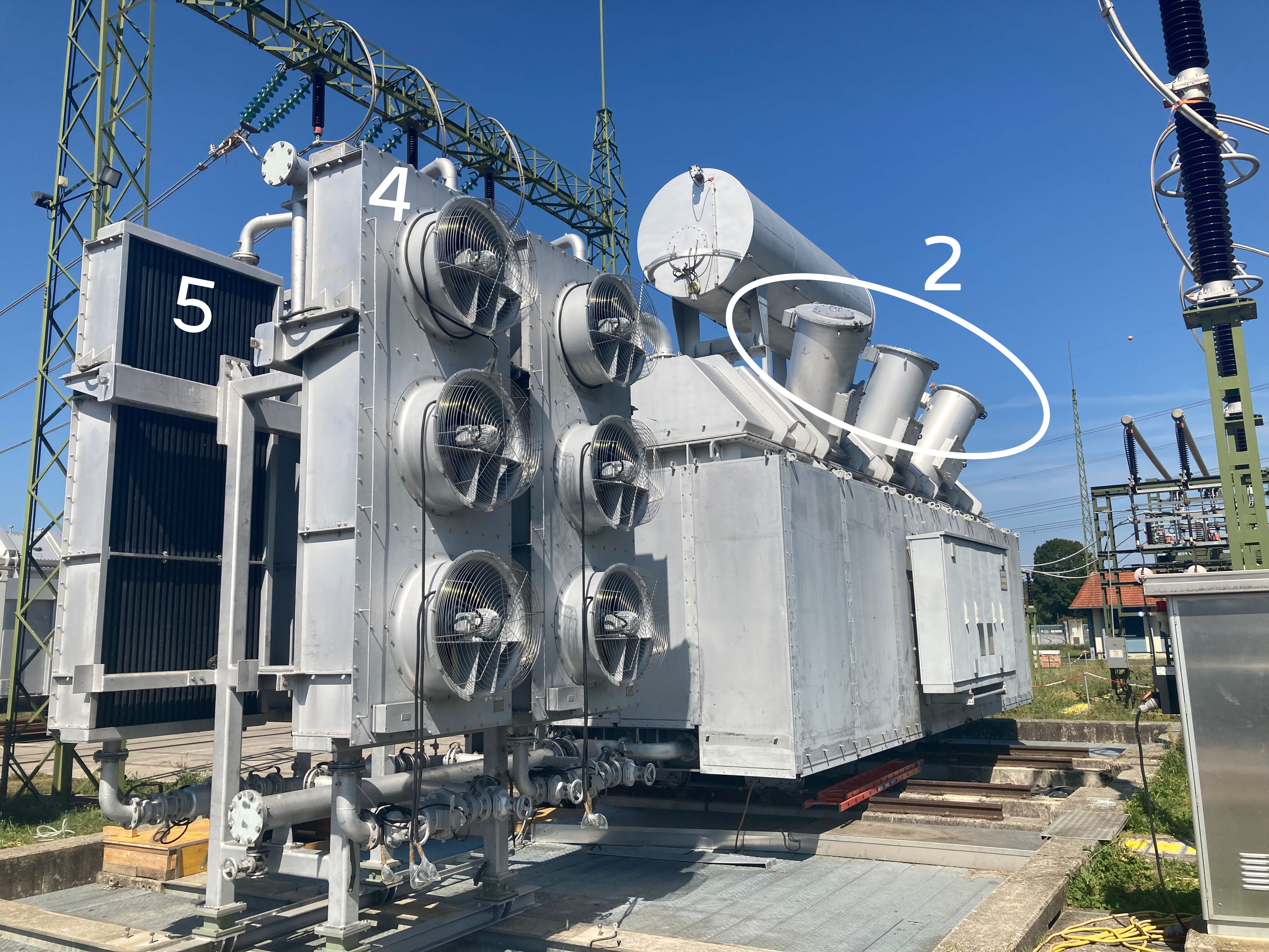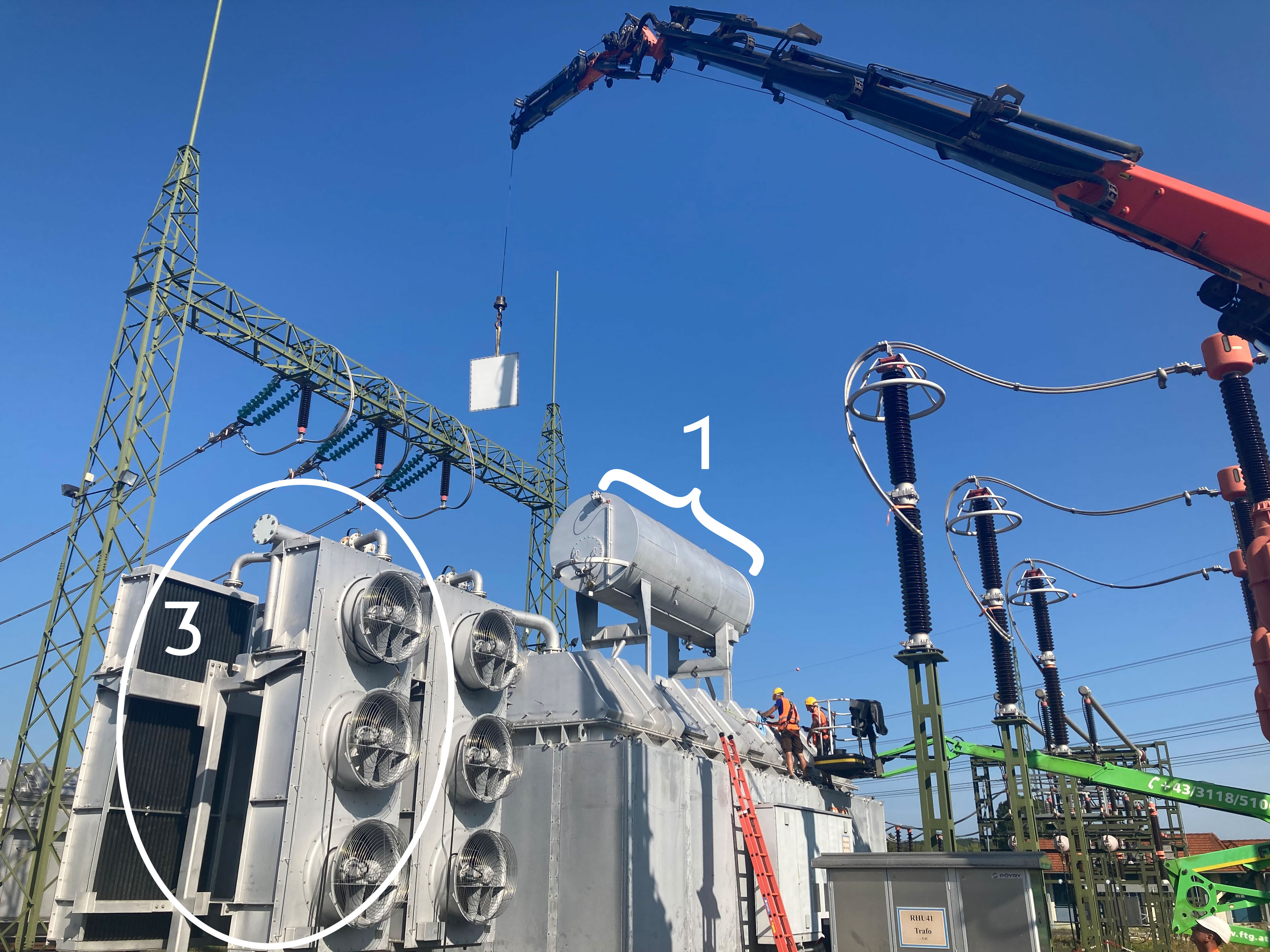 Und apropos Komponenten: Die Aufrüstung dauert mehrere Monate und umfasst unter anderem Dehngefäß (Nr.1), Durchführungstöpfe (Nr. 2) und Kühlanlage (Nr. 3). Letztere besteht aus Lüftern (Nr. 4) und Kühlrippen (Nr. 5). Die Durchführungstöpfe, von denen es insgesamt acht gibt - auf der 380-kV-Seite drei, auf der 110-kV-Seite fünf - bilden zusammen mit den „Kerzen“ (Nr. 6) die Verbindung zu den Hochspannungsanlagen wie Schaltfeld oder Leitung. So gelangt der Strom in den Trafo, wo er schließlich auf die benötigte Spannungsebene umgewandelt wird.