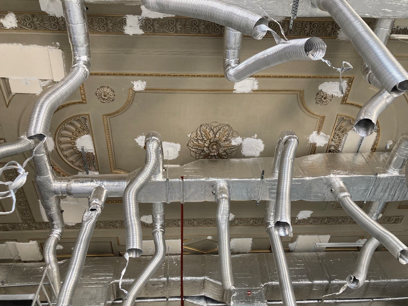 Die Neugestaltung des Saals durch ARGE A P Z architekturconsult I Atelier Pichelmann I Zone Media verbindet moderne Funktionalität mit der historischen Identität des Hauses. Statt das „Raum-in-Raum“-Konzept der 60er Jahre beizubehalten, wurden im Zuge einer behutsamen Restaurierung verborgene Gestaltungselemente wieder erneut sichtbar gemacht, restauriert und in die neue Raumgestaltung integriert.