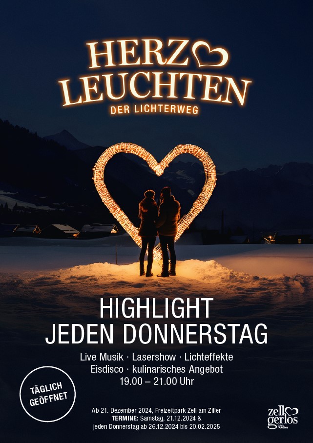 Das Herzleuchten wird am 21. Dezember 2024 ab 18.00 Uhr feierlich eröffnet. Freuen Sie sich auf die Musik der Gruppe „Tschentig“, eine Eisdisco und eine spektakuläre Lasershow - alles rund um den Freizeitpark Zell am Ziller. Der Eintritt ist frei und der Lichterweg bleibt den ganzen Winter über täglich geöffnet.