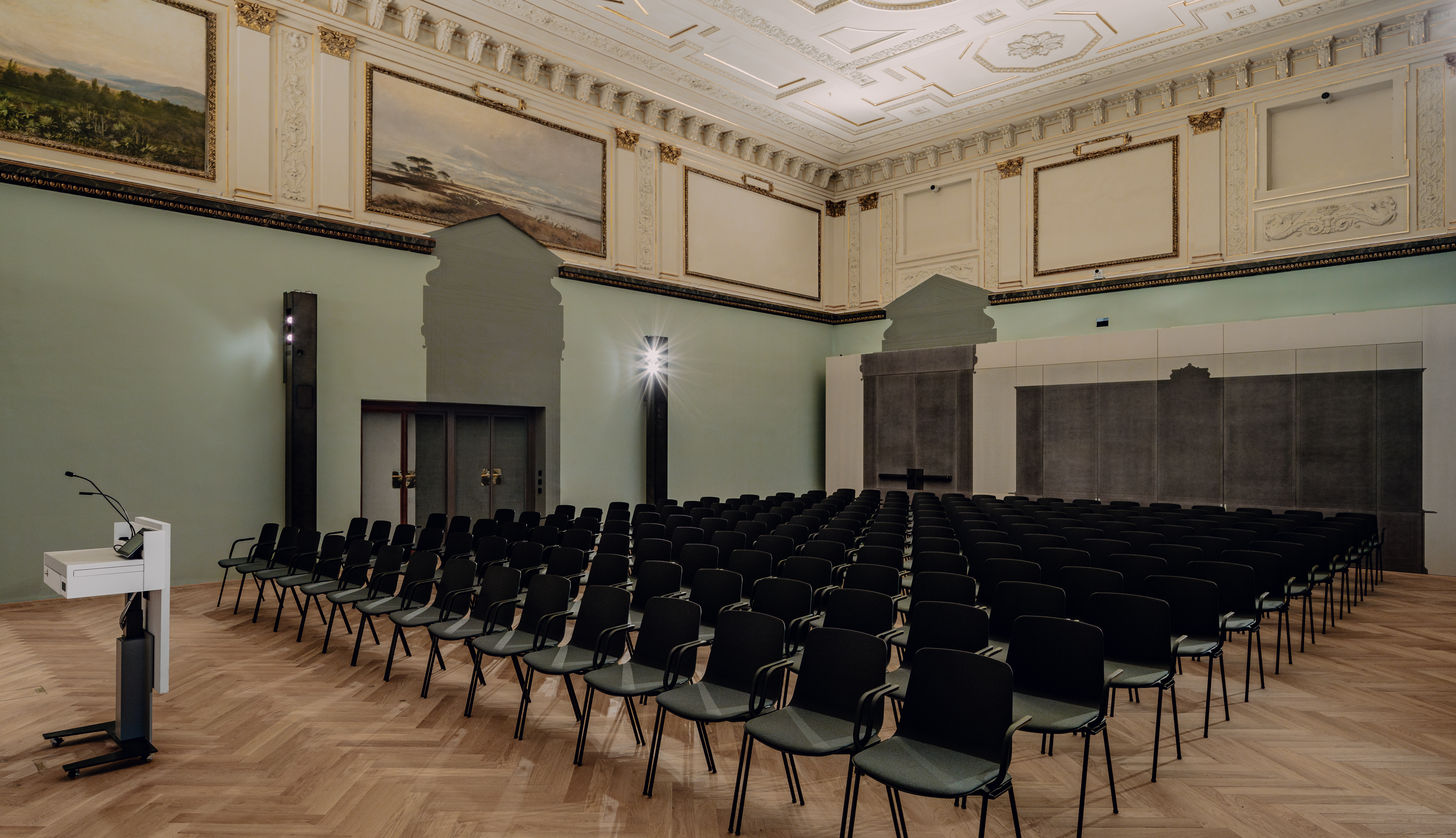Nach Monaten intensiven Umbaus fällt endlich wieder Licht in den neu gestalteten Vortragssaal XIX. Wo sich noch vor kurzem Schuttberge, Staubwolken und Metallgerüste türmten, können sich ab sofort Besucher*innen und Veranstalter*innen wieder am behutsam renovierten, historischen Ambiente erfreuen. Besondere Highlights: die prunkvolle Stuckdecke, topmoderne Funktionalitätsstandards und das luftige „leere-Raum“-Konzept von Atelier Pichelmann und ARGE architekturconsult.