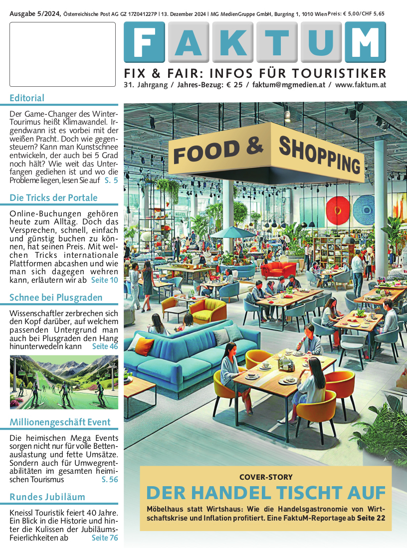 Außerdem lesen Sie im druckfrischen FaktuM unter anderem: Die schmutzigen Tricks der Reiseportale +++ Green Snow - Was künftig bei Plusgraden geht +++ Das Millionengeschäft mit den Events +++ Destination Dupes - Geheimtipps für smarte Reisende +++ Reisebranche in der Krise +++ Hotelüberbuchung - was tun?
